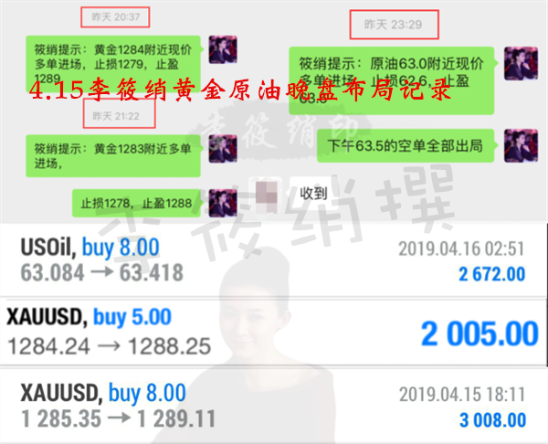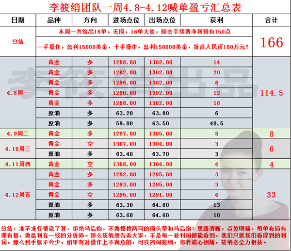 4.14李筱绡:黄金原油一周获利150点轻轻松松,下周行情精准预测跟上你也可以! 如果你点开这篇文章不是为了获利,意义何在,你坚定跟随,我渡你上岸!频繁套单,无非就是短线操作拿不住单子,毕竟瞎猜你也不可能每次反向,黄金原油可看大势,追逐小利的你,花费了多少时日,影响了多少心态,大亏小赚是你真实的写照,观我一文你不跟,阅我十章你自悔!微信指导:xd671438! 下面是筱绡本周带领实仓客户操作的情况汇总,筱绡本着初心,不会太多的花言巧语,没有眼花缭乱的盈利单子,只有一颗真诚的心,本周行情波动利润不少,筱绡总共带了八个实仓客户,按照资金量大小分为四个等级,针对性的采取了不同的投资方案,短线结合着