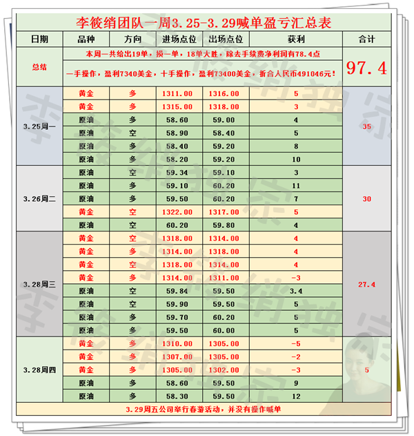 4.9李筱绡:黄金原油3月净赚400点完美落幕,四月精准布局,助你称王! 人生,所有的经历都是一种财富——筱绡语录 工欲善其事,必先利其器;日内交易计划! 黄金:多1294-96位置多,止损1290,看1301/1304; 空:触及1306轻仓空进场,止损1310,止盈1300-1298。 原油:多:稳健者63.0进多,激进63.7-64.0附近多,防守62.6,目标看65.0-65.5! 空:首次触及66一线空,止损66.5,止盈64.6-63.1-62.6; 波段多到目前价格64.7位置,已有600多点利润空间,日内继续做减仓持有;本轮极限反弹位70附近! 市场瞬息万变,分析不可能面面俱