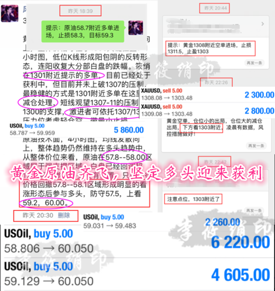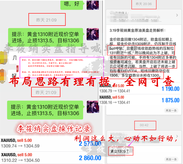 3.20李筱绡:美联储“山雨欲来”恐助金价进一步走高?金油最新交易策略,拭目以待! 黄金:多:稳健依托1301-1303支撑低多,激进1304多,损1300下方,目标1308/1310; 空:依托1311压力位,不破可空,最小止损止盈! 波段多单继续持仓,目标暂定1338-1342。 原油:多:激进者58.8附近可以轻仓布局多单,稳健58.4附近多,目标59.5-59.8附近! 空:关注上方59.8-60压力,企稳看跌信号布局空! 手上有单的朋友可联系本人,筱绡实时指导你操作手法,实时点位,会尽全力帮你解脱困境。 回顾我们思路,昨晚筱绡说到要看1311的压制情况,此位不破,是需要谨防回踩的,