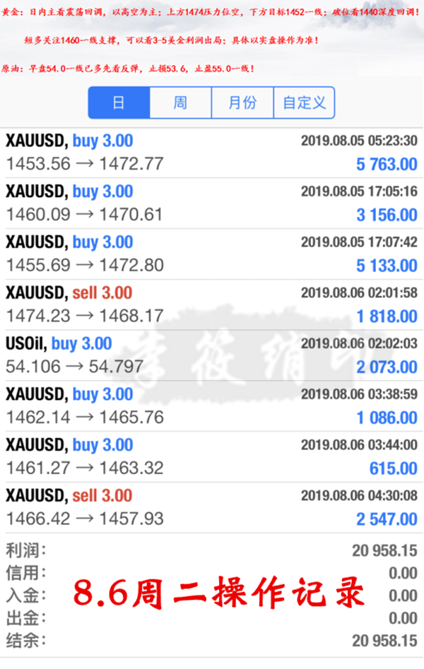 李筱绡:8.7黄金早盘20美金落袋;唯赚钱和爱情不可辜负! 读万卷书不如行万里路,行万里路不如阅人无数,阅人无数不如名家指路,名家指路不如筱绡带路,我依然是那个低调又有实力的李筱绡。 黄金原油近期暴涨暴跌,你还在一路逆势加仓,刚入市场就被淘汰出局?如果你没有稳定的思路、没有严格的止损、没有基本的教学,而只是一味用盈利作为诱饵,这绝不是稳健的投资!那么,如果你还陷入这样的困境里面,希望我能帮你从懂得这个市场开始,再谈盈利,实力需要在实时行情中验证,而非一两次的收益! 8.6黄金原油操作记录: 周二主要思路是看震荡回调,咱们主要高空为主,52支撑上多,晚盘多空转变灵活