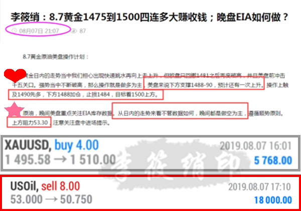 李筱绡:8.11黄金1490必须多一次;原油改变方向了! 读万卷书不如行万里路,行万里路不如阅人无数,阅人无数不如名家指路,名家指路不如筱绡带路,我依然是那个低调又有实力的李筱绡。 黄金原油近期暴涨暴跌,你还在一路逆势加仓,刚入市场就被淘汰出局?如果你没有稳定的思路、没有严格的止损、没有基本的教学,而只是一味用盈利作为诱饵,这绝不是稳健的投资!那么,如果你还陷入这样的困境里面,希望我能帮你从懂得这个市场开始,再谈盈利,实力需要在实时行情中验证,而非一两次的收益! 8.5-8.9黄金原油操作记录: 若面对一块石头,把它背在背上,它就会成为一种负担,把它垫在脚下,