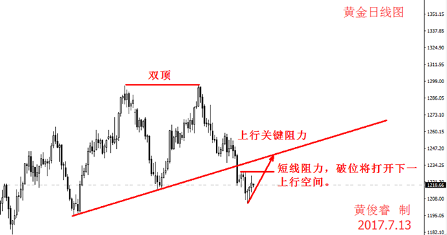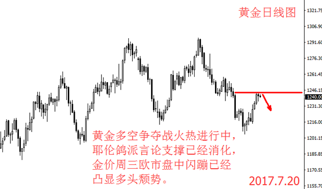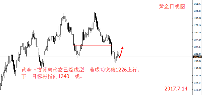 黄金7月14日(周四)亚市盘中冲高1224美元位置后回落,欧美盘时段最低下踩1215美元一线后收盘于1216低位,黄金连续三天上涨后的首次回调仍处于耶伦讲话前的水平上方,黄金涨势还未结束; 黄金周四走势和黄俊睿老师预测比较吻合,欧美盘时段回落后未出现拉伸,这也是为了更好的修正黄金技术面走势,周三耶伦发出久违的鸽派声
