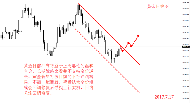 7月之前市场一片鹰声打压的黄金无法抬头,上周耶伦的一通鸽派言论终于让黄金迎来久违的甘霖,金价周五美市盘中一路冲高了日线布林带中轨1233美元位置,虽然目前鹰声阵阵的画风突变,但美联储年内继续加息的预期还是会对黄金上行造成严重阻碍. 此前FOMC会议上发表的声明显示,美联储政策的措辞比预期更为强硬,但在本周四(7月