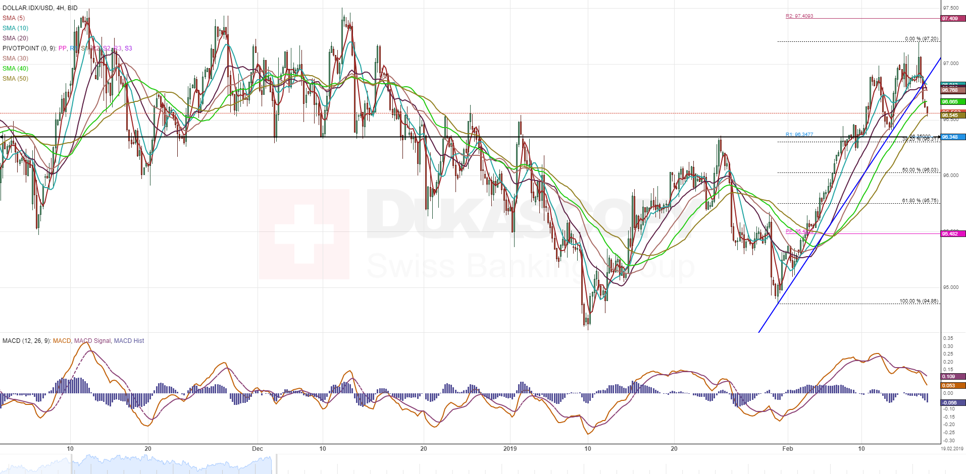 近期,美元强者归来。自鲍威尔在1月末的利率决议中发表鸽派言论之后,本月美元指数一路高歌猛进逼空上涨,日线收获8连阳并且一举突破97关口,目前距离去年高点97.50仅一步之遥。本周,美国将相继发布CPI以及PPI等重要宏观经济数据,美元短线或面临压力。 美元短线压力主要体现在几个方面。首先,通胀率下行或进一步降低美联储加息概率,成为短期趋势转空的动力源头。由于原油价格下行,全球经济增速回落,美国1月CPI预期将进一步回落至1.5%的水平,或为两年以来的新低,12月份这一数字为1.9%。这将远低于美联储将通胀利率维持在2%的目标值。该数据的进一步滑落将进一步影响美联储