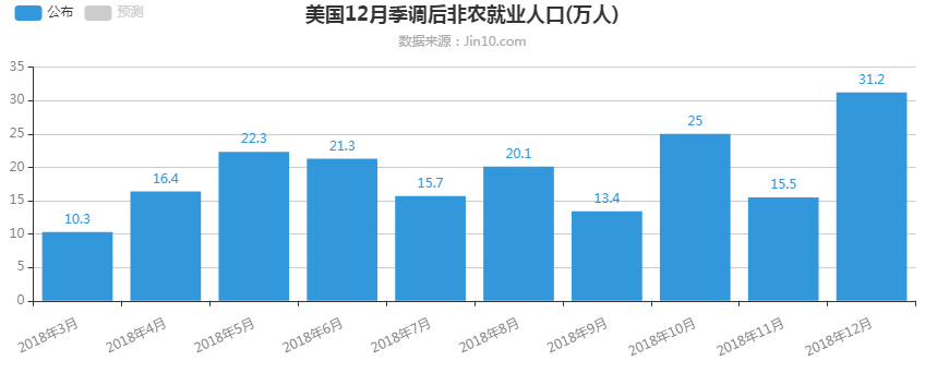 1月4日上周五晚,北京时间9点半,美国劳工部发表12月非农人口就业人数。具体数据显示,美国12月季调后新增非农就业人口31.2万,创2018年2月以来新高,远高于预期的18.4万,前值由17.6万下修至15.5万;美国12月平均小时工资年率录得3.2%,分别高于预期值和前值0.2和0.1个百分点,录得2009年4月以来最高;尽管美国12月失业率回升0.2个百分点至3.9%,但仍处于历史低位附近,美国经济依然接近充分就业状态;况且美国12月劳动参与率录得63.1%,创自2017年9月以来新高。 不过对于靓眼的非农数据,美元却并不买账。尽管数据发布后美元指数一度冲高将近 0.4%,但是随后却