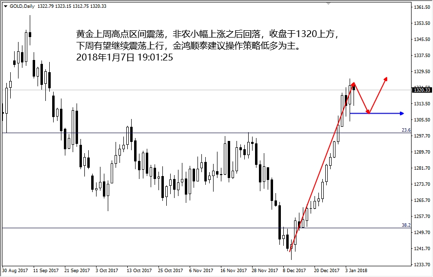 01-07周评,黄金多头喘息,下周走势分析与策略 市场消息 新年第一个非农于落下帷幕,数据表现上新增就业岗位数量远不及预期令人大跌眼镜,美元依旧围困于低位一蹶不振,而黄金本周虽失去了前期的强势,但是经过高位的整理之后价格依然良好的企稳在关键支撑1312上方,且本周强势收盘在1320一线,非农数据的利好对于黄金下