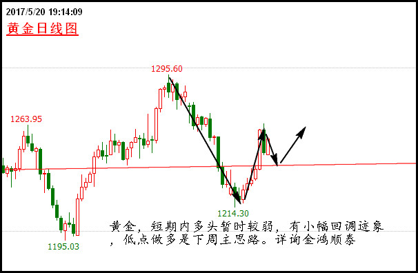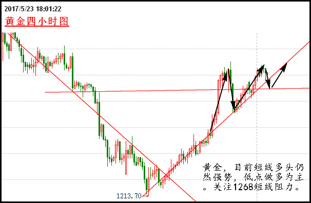黄金延续昨日反弹趋势,早间高开高走,重回1260水平上方。近期黄金仍受助于多重因素支持,此外,德国总理默克尔意外喊话欧元太弱,猛烈重挫美元,也令黄金获益。目前,黄金已基本快收复5月以来的跌势,5月来形成一段弧形走势,至于下一步能否更上一层楼,除了消息面需要配合之外,技术层面的关键阻力压制在1270水平一带。
