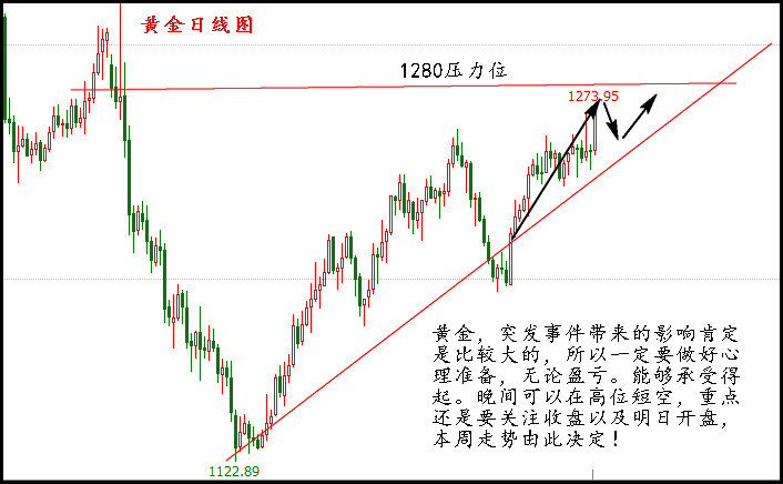 国际现货黄金上周五(4月7日)大幅下跌,美市盘中最高上探至1270.46美元/盎司,升至5个月高位,金价成功连破1260、1270关口,也突破了200日均线的阻力位,录得连续第四周上涨,但随后金价出现跳水,几乎回吐日内涨幅。周五黄金曾迎来了久违的上涨契机,先是美国对叙利亚实施导弹袭击,全球政治局势紧张,避险需求蜂拥,黄金