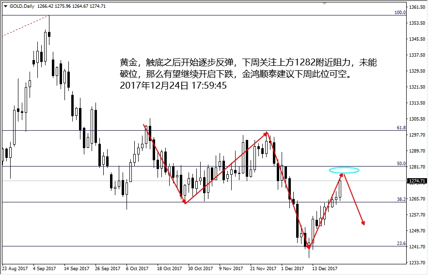 市场消息 上周的黄金市场走势真可谓步履瞒珊,自周初盘延续此前上涨后,此后连续四个交易日均维持在1260一线上方整理。周中经历了美国税改的顺利通过与三季度GDP数值的公布,然而在这样重大基本面讯息下,黄金仍旧没有实质性突破持续的小区间震荡,直到周五盘才得以突破上探至最高的1276美元。十美金的涨幅用了四天时间,慢