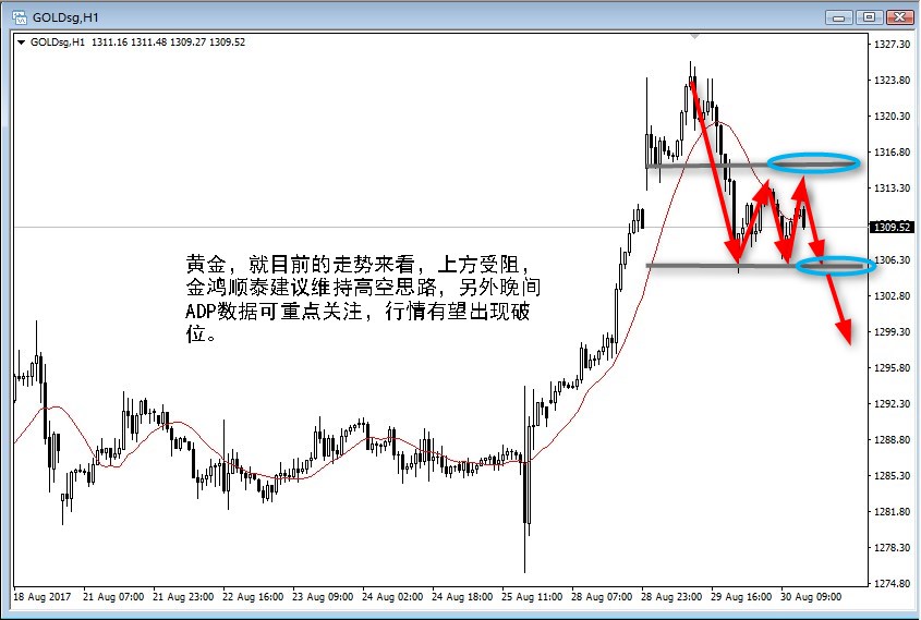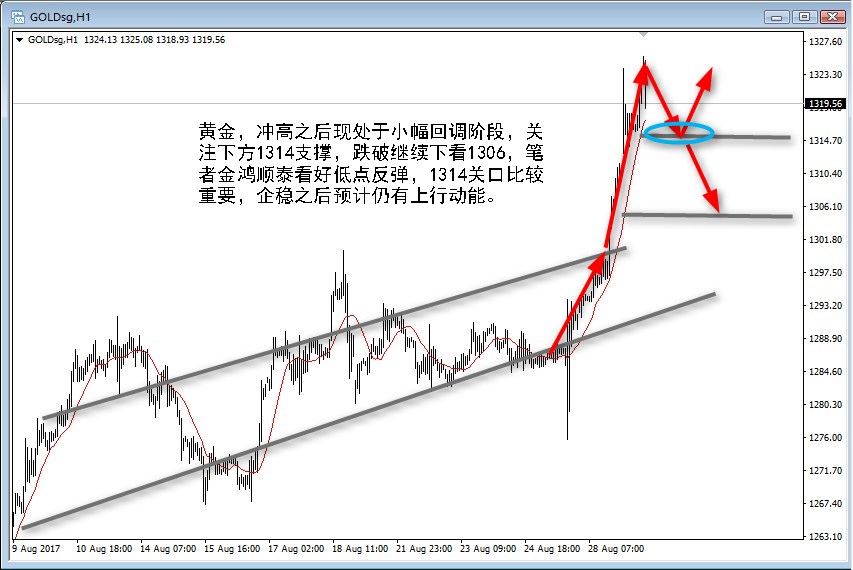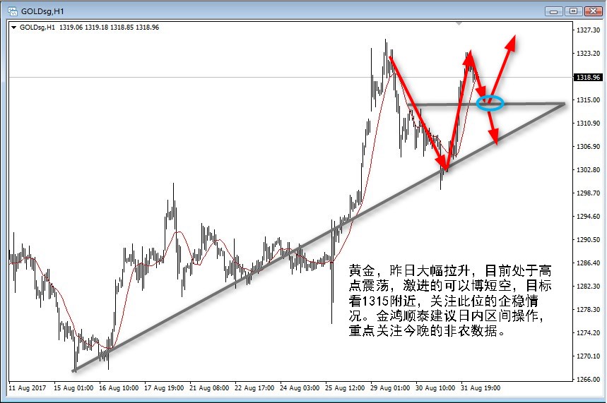 8-30晚评,小非农助力黄金破位,EIA提前布局 市场消息 昨天市场上演了一场惊心动魄的倒V反转,白天黄金因朝鲜避险短线暴涨20美元,然而在晚间,由于多头选择获利抛售,金价从1325美元高位直线回落,不但收回日内涨幅,还录得一根阴线,虽然在1310美元附近受到支撑,但形势并不乐观。 黄金价格自年内新高的回调与避