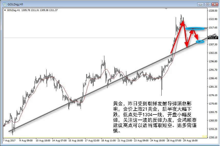 市场消息 金三胖为了弥补上周六(8月26日)连发三枚导D的失败,趁着周围放松警惕,又丢了一枚!嗯,这次是成功了,导D不但越过了日本领空,还遭到了日本官方的严重抗议。市场对三胖的行为表示震惊,大家都未曾料到朝鲜如此强硬,一时间,局势紧张升级,避险情绪重新燃起。 那么这次朝鲜局势引发的避险可以推升金价多久呢?这个问