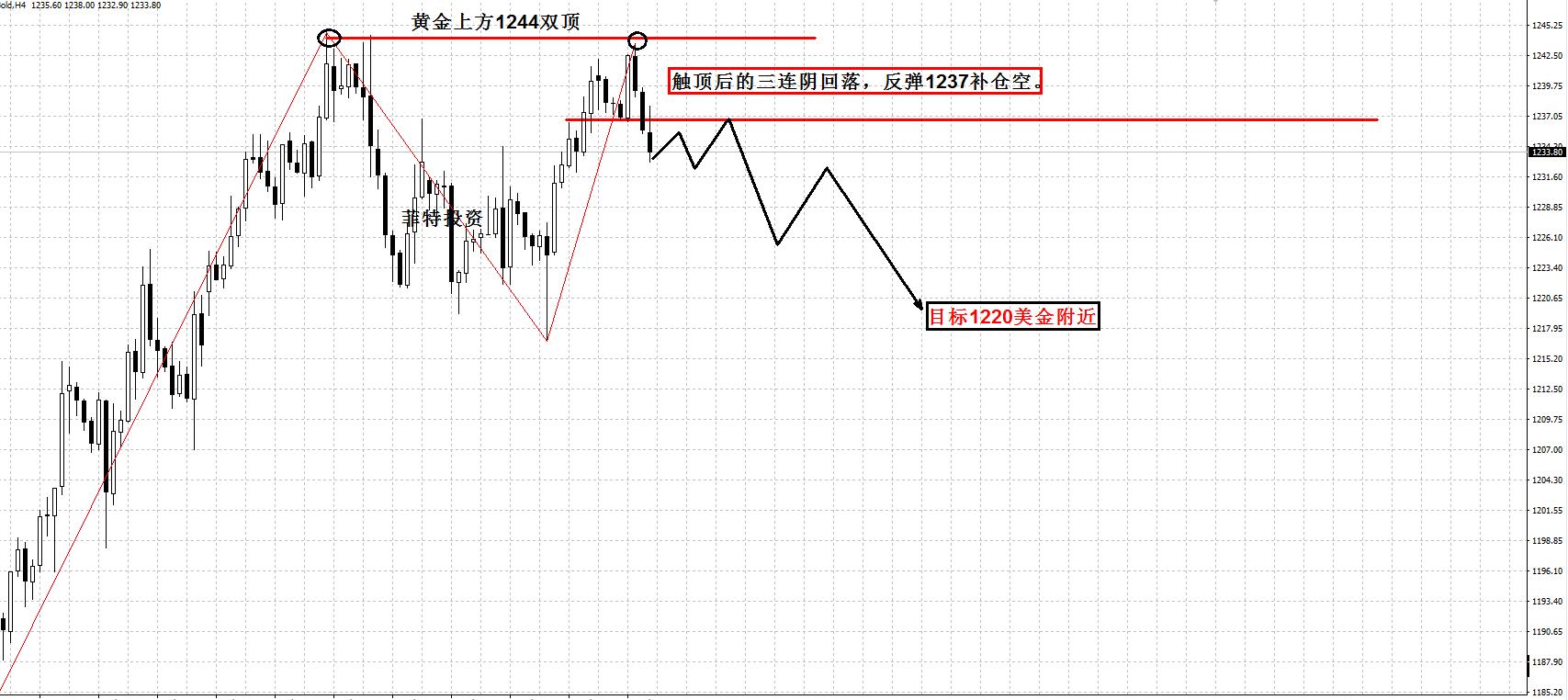 菲特投资:黄金三连阴触顶回落,反弹1237补仓空。 友情提醒:年前本人推荐的黄金双顶1220开空,目标1203止盈后出局。 点击文字****推荐文章:菲特投资:2017.1.26黄金做空,知行合一! 本人主要分享的主要产品内容:黄金,白银,天然气,原油。 ( 要想成为一个伟大操盘手, 的确需要自然禀赋,需要坚韧 专注 果敢 忍耐 还要
