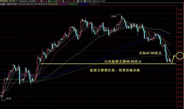 菲特投资:追涨杀跌需谨慎,反手做多目标先看47.50 我个人认为,投资者并非每次都需急着入市操作,初入行者往往热衷于入市买卖,但成功的投资者则会等待机会,当他门入市后,感到疑惑或不能肯定时亦会先行离市,暂抱观望态度。 以前期支撑位46.50美元作为日内支撑标准,短线欧盘没有形成下破,美盘短线形成反弹,目前已经突