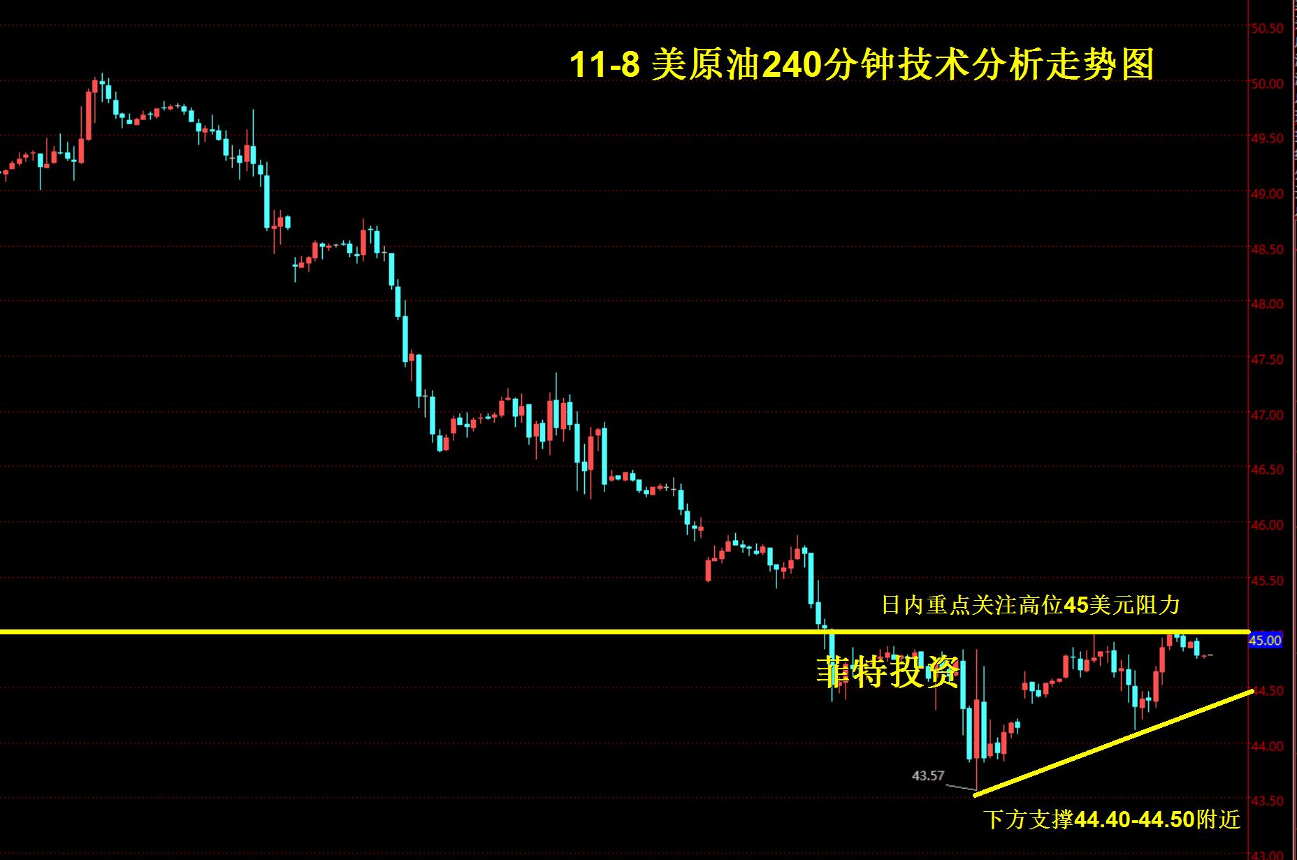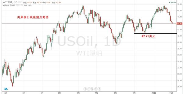 菲特投资:原油最新消息,油价或将走低至40美元! 周二(11月1日)良好的美国数据并未提振美元,因在美国大选临近之时,投资者都在关注大选的选情,最新民调显示特朗普的支持率大幅上升,这激发了市场的避险情绪,打压美元提振金价。原油方面,市场对OPEC减产计划的疑虑对油价不利,而最新数据显示,API原油库存意外大增进一