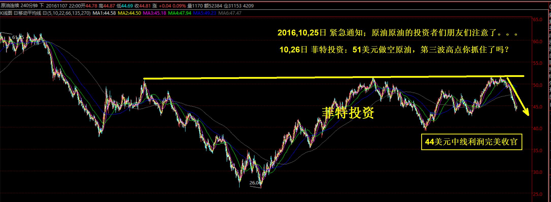 菲特投资:油价中线看空,目标44美元完美收官! 推荐文章: 紧急通知:做原油的投资者们请注意了。。。 菲特投资:51美元做空原油,第三波高点你抓到了吗? 行情过后,无数人没有在装逼,就是在去装逼的路上,现在你骂装逼说爆赚的人,是因为你还不了解他,等你以后了解了,你一定会动手打。这个市场最残酷的现实就是赚钱的