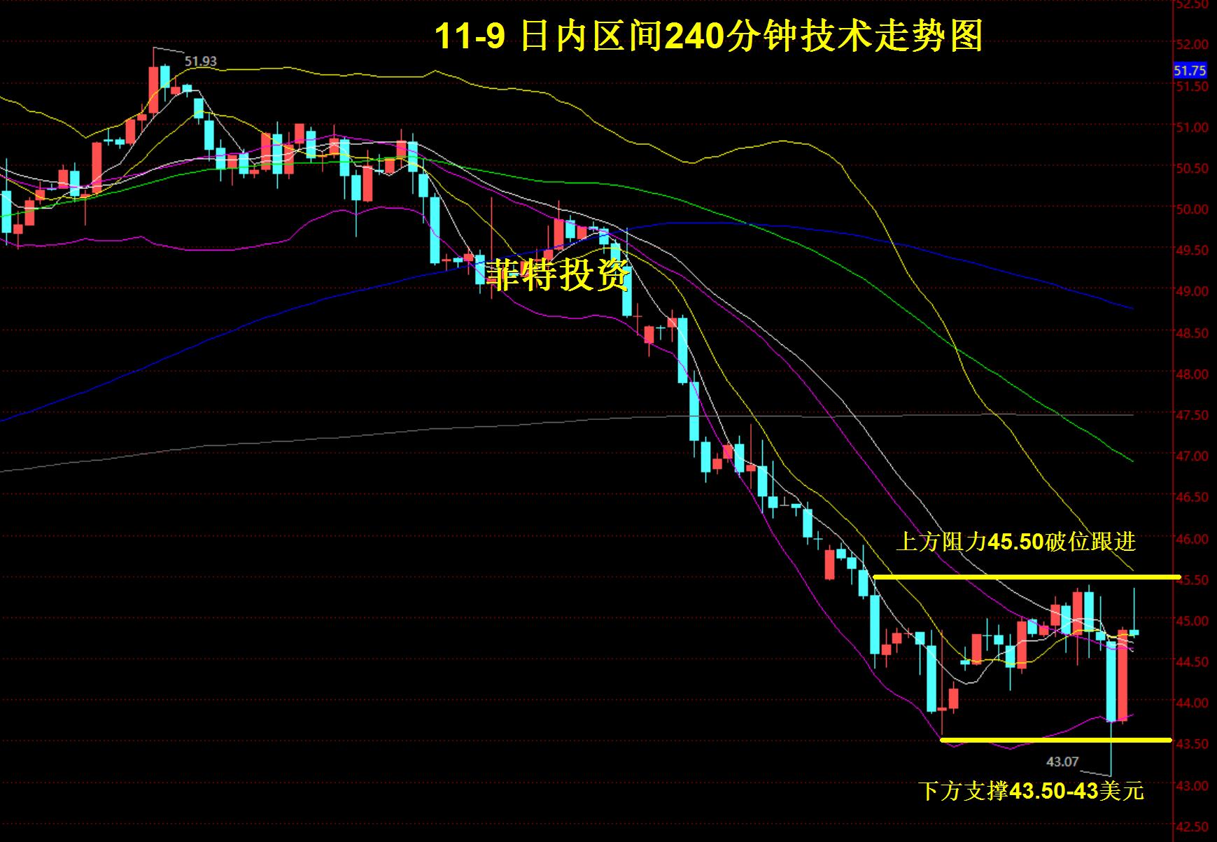 菲特投资:本年度11月油价第三波低点(精品) 昨晚20:49分; 公众号发文:油价中线看空的朋友,目标44美元到点位该注意平仓收益的时候了。 原文内容:菲特投资:油价中线看空,目标44美元完美收官! 前言内容: 紧急通知:做原油的投资者们请注意了。。。 菲特投资:51美元做空原油,第三波高点你抓到了吗? 本周一随着油价
