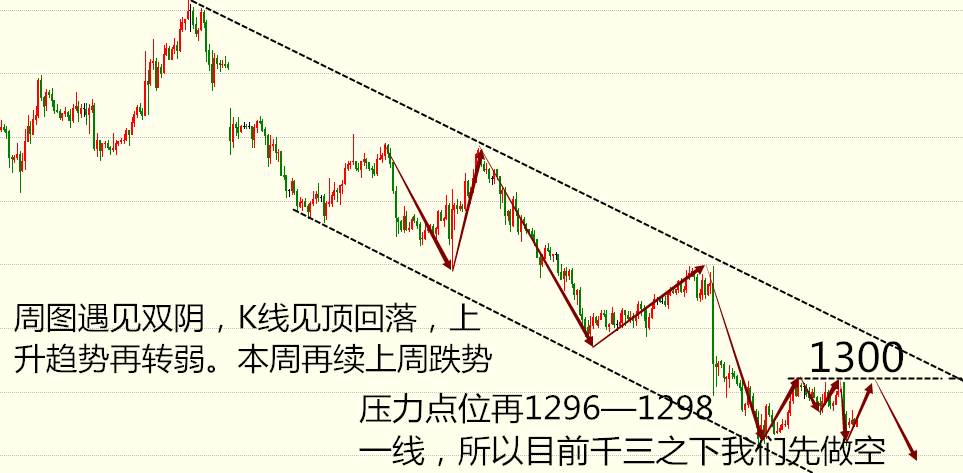 上周回顾 上周的黄金,追单都可以赚钱,问题是你有没有及时的去改变思路?做单,顺势固然重要,但是方向错了之后需要及时去止损反手,不要总是保证侥幸的心理去抗单子,博点位,随波逐流不好吗,一定要激流勇进? 大阴压境顺势空 黄金周大阴压境,周初依托短线的一个均线开始震荡承压走低,有望继续延续此前的弱势格局。地