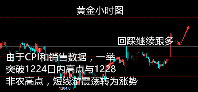 原油方面,昨日日线收取阳柱,今日延续昨日涨势,小时图级别上,K线运行于布林中上轨,布林带不断向上开口,油价短线再次回落,下方关注46-46.1一线支撑,午夜操作的朋友可以在此买入,控制好风险。 黄金方面,cpi和销售数据,在上个月公布中曾让黄金暴涨10美金,今晚20:30公布了cpi和销售数据,又瞬间让黄金暴涨。公布数据