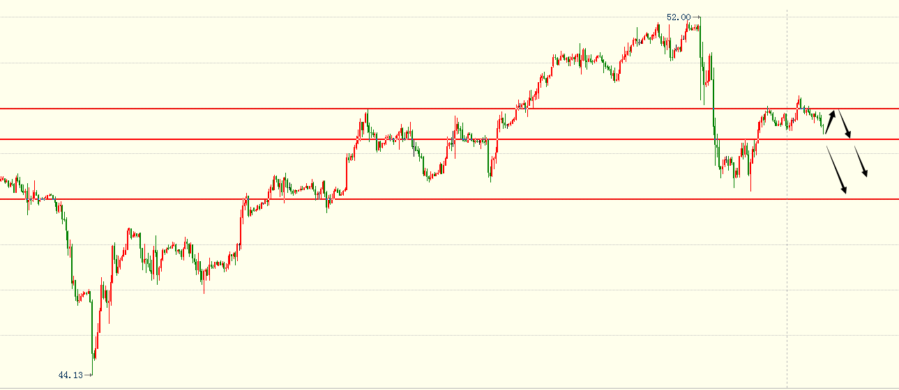 三大遗憾:不会选择;不坚持选择;不断选择。 三大陷阱:大意、轻信、贪婪。 三大悲哀,遇良师不学,遇良友不交,遇良机不握。 三不斗:不与君子斗名,不与小人斗利,不与天地斗巧。 三修练:看得透想得开,拿得起放得下,立得正行得稳。 原油行情分析 美原油昨日欧盘震荡运行后出现小幅上冲,在触及52美元时承压开始瀑布势