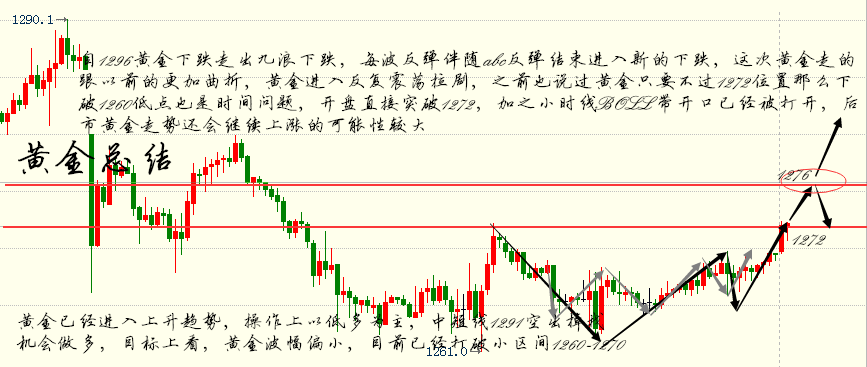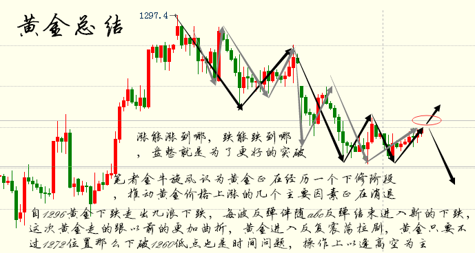 本周总结:黄金周一早盘直接跳空高开,随后走低,日线顶部收阴,周二黄金继续回落探底后拉升,日线翻阳,周三行情再次选择大幅度走低,盘中一度跌至1274一线止跌,周四行情围绕1280一线形成小区间震荡,周五行情震荡之后选择拉升冲高至1288随后回落,日线收阳,周线顶部收阴。 下周展望:本周黄金周线收小阴,对后市会形成