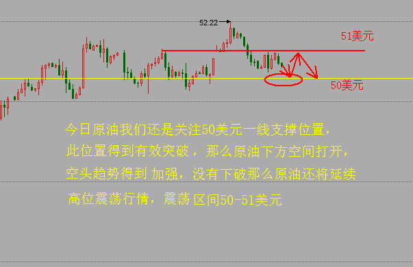 今日,原油反弹的压力点依旧是上周五形成的51美元一线,这也是我在上周五我给出的50.2美元多单的止盈点位,支撑在50美元一线位置,只有突破51反弹才能继续,反之价格会承压回落,但是回落还是需要考虑在50-50.1的位置支撑,防守我们下移49.6美元一线下方,以上两个位置任何一个都没突破之前我们需要灵活的看待行情,区间来