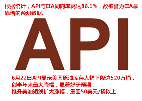 金世纵横:6.22API库存暴走,日内操作坚定看多空单解套 导读:北京时间周三04:30公布的美国至6月17日当周API原油库存大减522.4万桶,远超预期的减少190万桶,前值为增加115.8万桶。API数据公布后,美油短线走高触及50.26美元/桶。另外晚间10:30的EIA数据和次日的退欧公投值得关注。 从此次数据我们可以看出,库存数据大减,