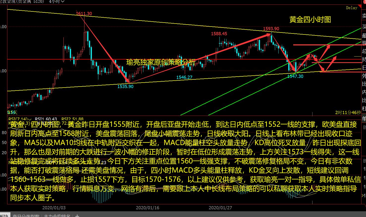 黄金,四小时图,黄金如期走完回调后然后继续上攻,当前走势看,外部环境影响下,美伊关系,外界疫情突破公共卫生事件,美元下跌等,使得黄金在避险情绪影响下,黄金短线经过三角收敛突破,回调之后上涨动能量强劲,技术面,月线,继续收阳,MACD多头能量柱放量,KD金叉向上放量,多头能量强劲,周线,MACD多头能量柱放量,KD金叉向上放量,上涨趋势通道良好,日线,MACD多头能量柱二次放量,多头强劲,四小时,已经走出三角收敛突破,MACD多头能量柱放量,KD金叉向上放量,因此下周依旧回调做多为主,日图来看价格至1536上涨以来,多次回踩MA10均线支撑未能下破进行反弹走高,暗示买盘强劲,后续随着价格的上涨