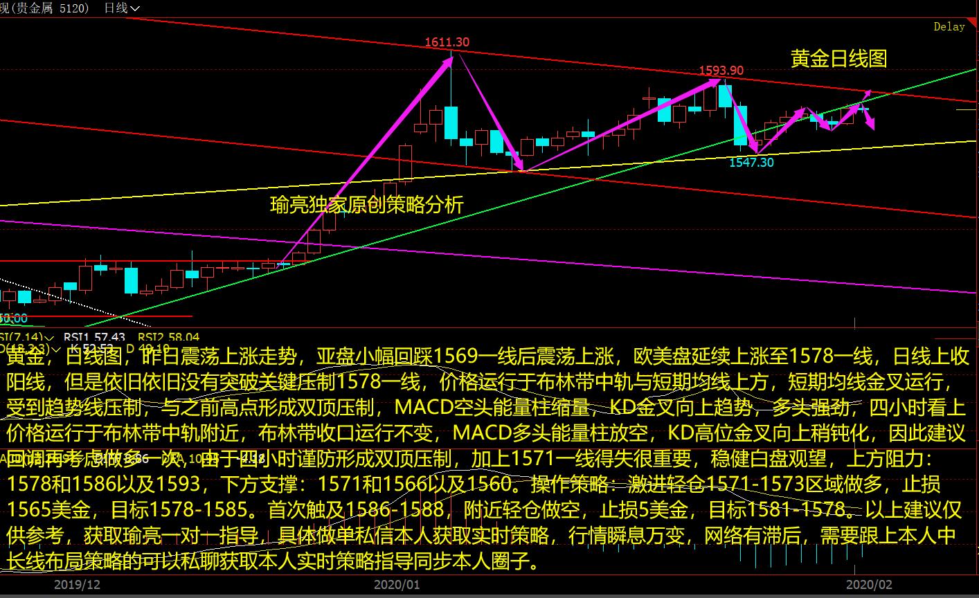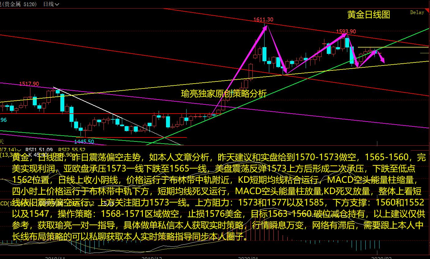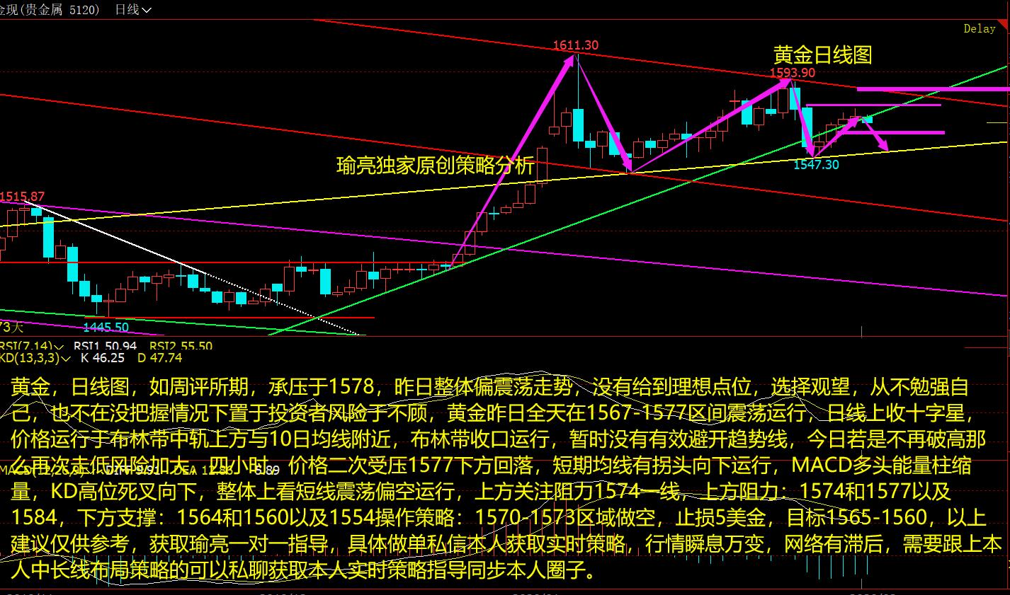 黄金,日线图,黄金近日走势比较弱势,但是一直都是震荡行情,从黄金日图来看价格三连阳,短期阻力在周五的高点1576附近,价格整体处于震荡上涨趋势中,涨涨跌跌,目前点位可上可下,操作中不要去追涨,待回关键支撑可以去做多,关键压制去轻仓空即可,周线方面,MACD多头能量柱放量,KD金叉稍钝化,但是趋势线依旧有效,日线,KD死叉钝化。配合附图指标MACD绿色能量值缩量,下周开盘价格继续震荡走高概率较大,时间换空间,建议依旧关注1560-1563一线区域低多点位,若是这一区域再次被击穿,谨慎看多了。上方压制1576和1583以及1588,下方支撑1563和1555以及1550。以上建议仅供参考,获取瑜