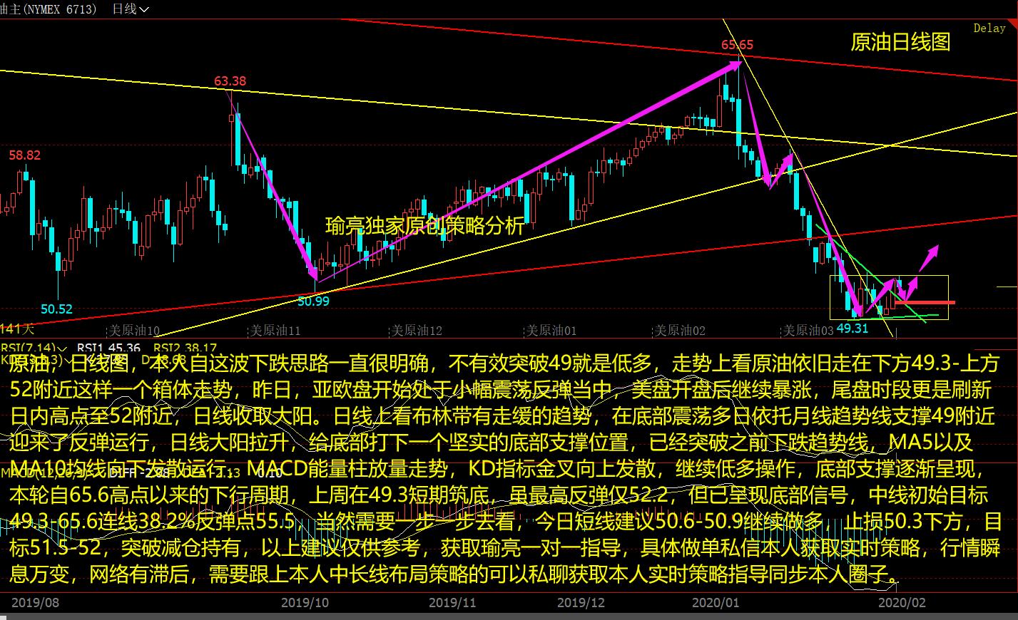 原油,周线图,周五再破新低由于市场担心需求的担忧,市场预测中国第一季度需求每日减少25万桶,整体价格震荡偏空运行,本周三和周四价格下跌的过程中,伴随着反弹修复诱多,价格高低点不断走新低空头动能较强,操作方面待反弹可顺势参与空,技术面方面,月线,MACD空头能量放量,KD钝化有死叉向下趋势,空头能量还是强势,周线,四连阴空头强势,MACD多头走尽空头放量趋势,KD高位死叉,空头趋势明显,日线,MACD空头能量持续放量,跌破之前趋势线,因此激进者短线油依旧还是反弹做短空为主,下方关注50.5之前低点强支撑,由于下方空间有限,稳健者先观望,重点关注50.5情况再定,跌破将见48.5附近月线趋势线支