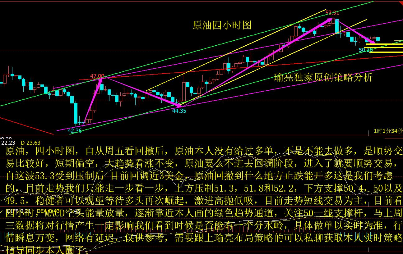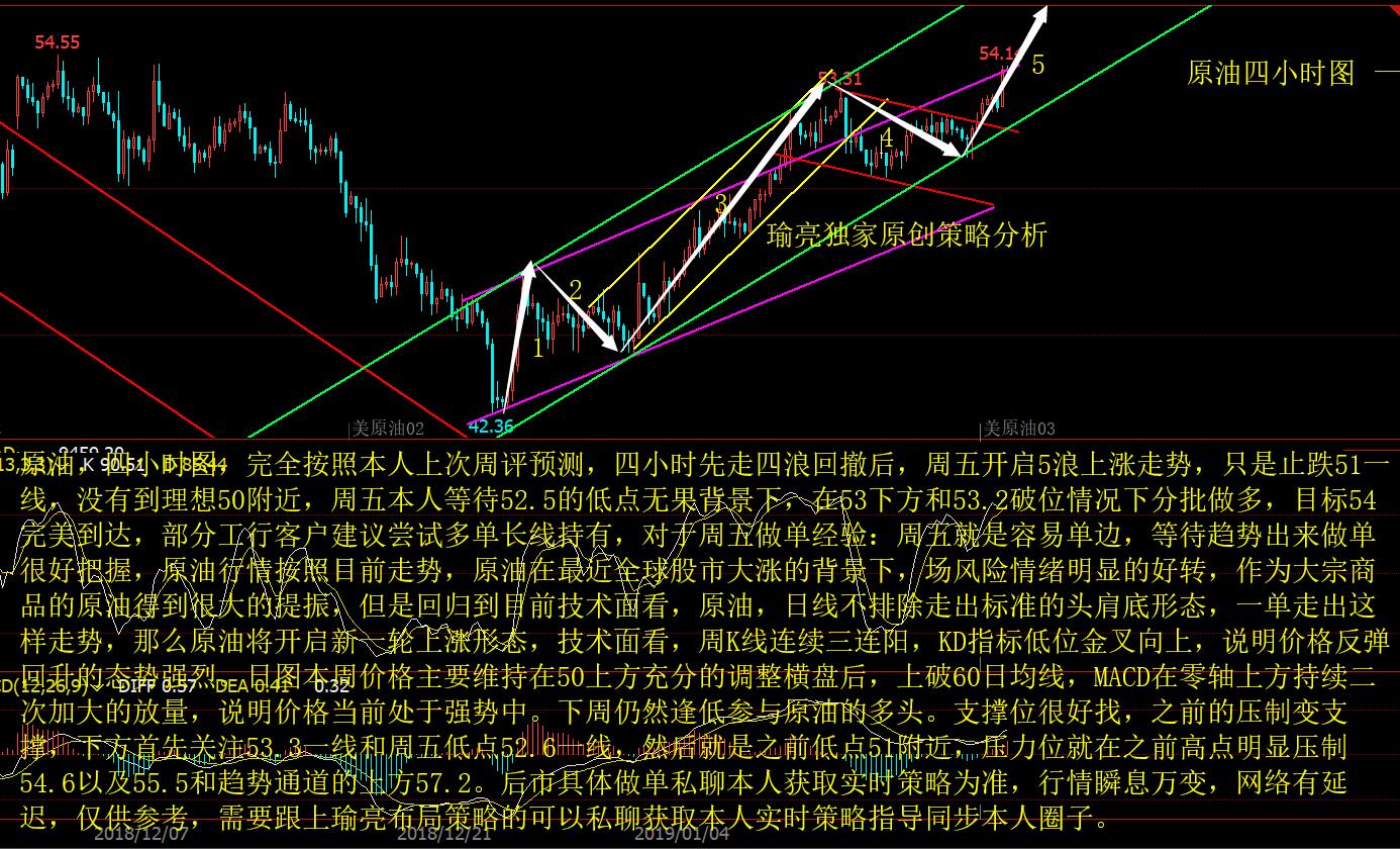 原油,四小时图,完全按照本人上次周评预测,四小时先走四浪回撤后,周五开启5浪上涨走势,只是止跌51一线,没有到理想50附近,周五本人等待52.5的低点无果背景下,在53下方和53.2破位情况下分批做多,目标54完美到达,部分工行客户建议尝试多单长线持有,对于周五做单经验:周五就是容易单边,等待趋势出来做单很好把握,原油行情按照目前走势,原油在最近全球股市大涨的背景下,场风险情绪明显的好转,作为大宗商品的原油得到很大的提振,但是回归到目前技术面看,原油,日线不排除走出标准的头肩底形态,一单走出这样走势,那么原油将开启新一轮上涨形态,技术面看,周K线连续三连阳,KD指标低位金叉向上,说明价格反弹