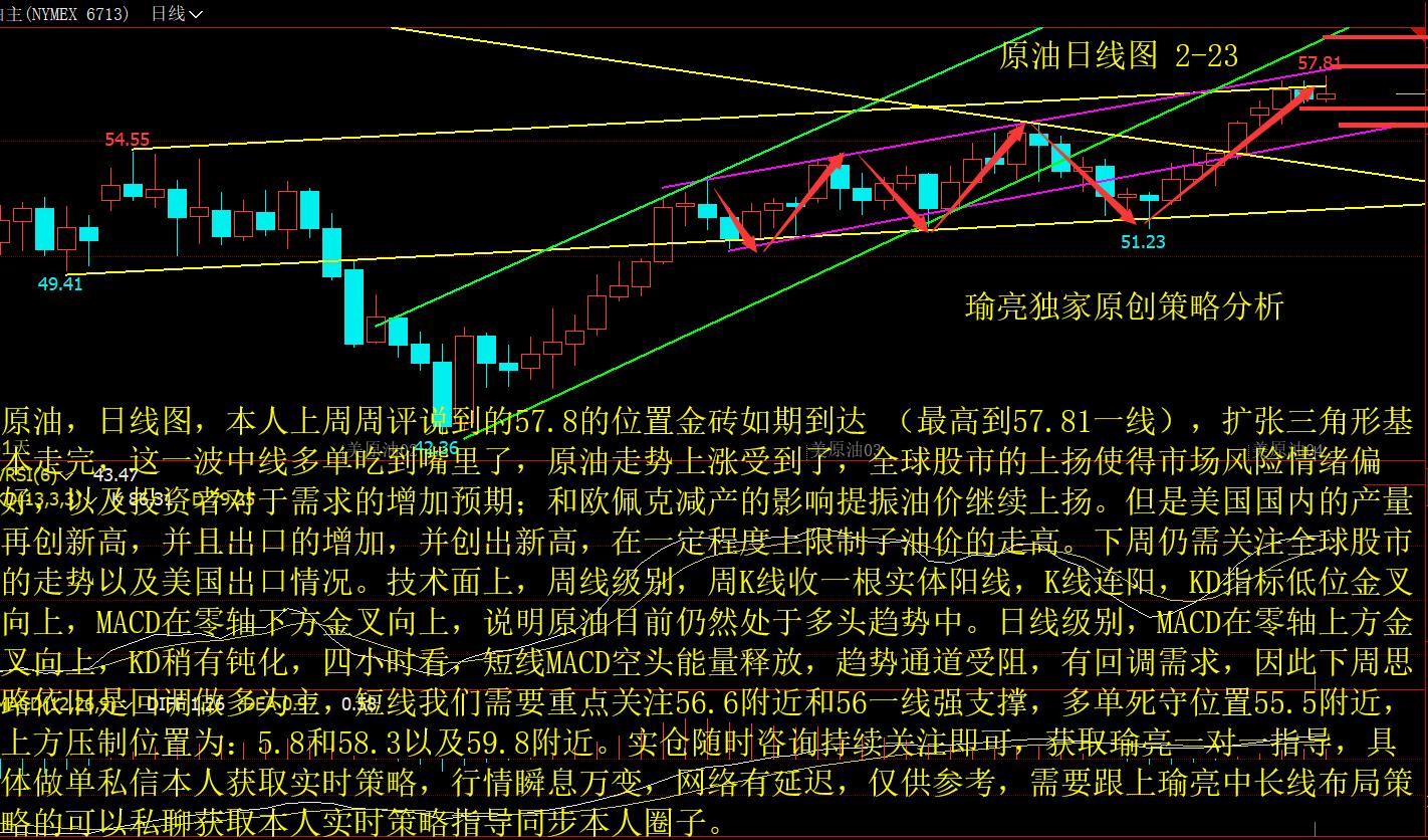 原油,日线图,如期,原油延续本人周评预测继续走日线级别扩张三角形,整体看日线也是本人之前曾有强调,预测的可能是走头肩底形态,目前看完全走出来了,最高到达57.6一线,日线K线实体阳线,日线已经7连阳,目前价格沿着日线5日均线上涨,MACD多头放量,说明当前走势依旧强势,按照本人之前预测到达57.8后有一定压制,若是突破将有肯宁冲击60美元甚至62美金的可能,对于今天行情,今天我们依旧回调做多,关注昨天压制区域56.7-56.6,已经有压制变为短线的支撑,今天若是回落确认,没有多单的可以继续参与,止损56.1,目标57.5-58,之前本人实仓有参与53.4的多单目前已经盈利4美金,还有中途提示