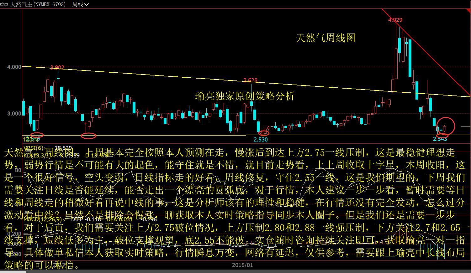 天然气,周线图,上周基本完全按照本人预测在走,慢涨后到达上方2.75一线压制,这是最稳健理想走势,弱势行情是不可能有大的起色,能守住就是不错,就目前走势看,上上周收取十字星,本周收阳,这是一个很好信号,空头变弱,日线指标走的好看,周线修复,守住2.55一线,这是我们期望的,下周我们需要关注日线是否能延续,能否走出一个漂亮的圆弧底,对于行情,本人建议一步一步看,暂时需要等日线和周线走的稍微好看再说中线的事,这是分析师该有的理性和稳健,在行情还没有完全发动,怎么过分激动看中线?虽然不是排除会慢涨,聊获取本人实时策略指导同步本人圈子。但是我们还是需要一步步看,对于后市,我们需要关注上方2.75破位
