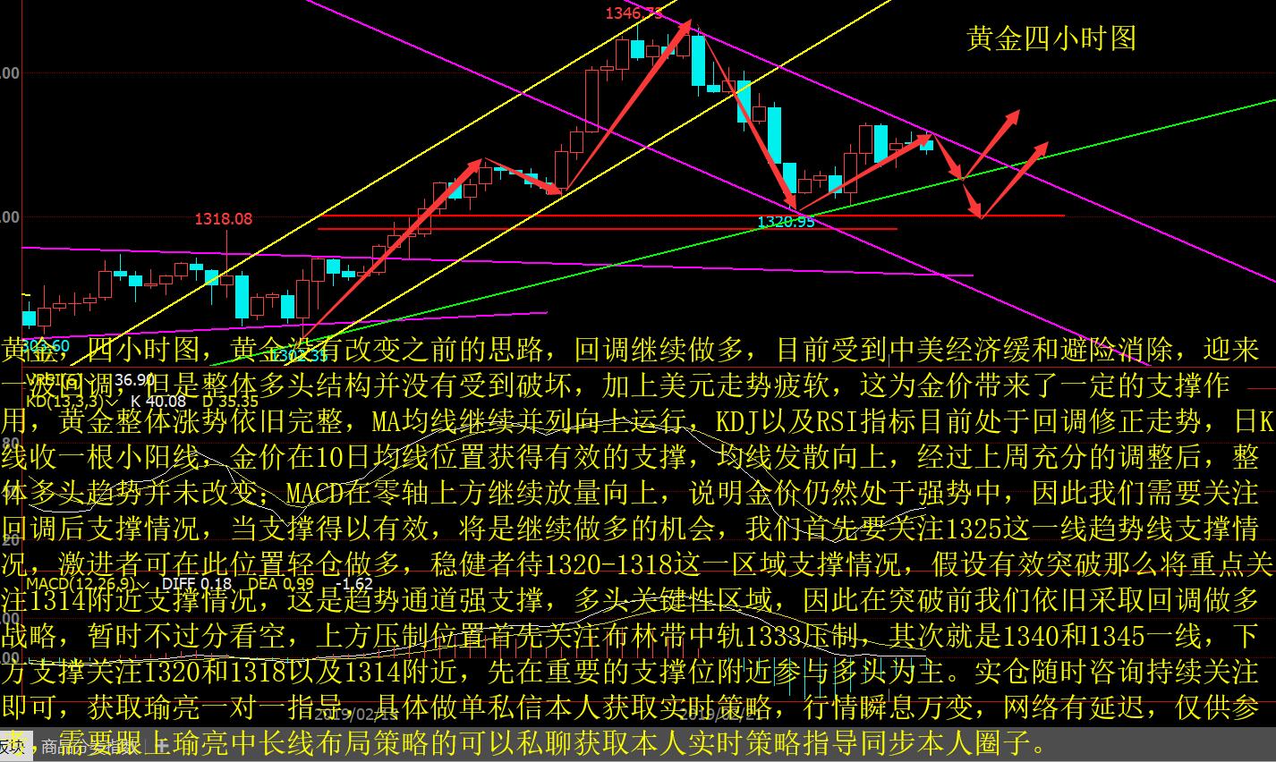 黄金,四小时图,黄金没有改变之前的思路,回调继续做多,目前受到中美经济缓和避险消除,迎来一波回调,但是整体多头结构并没有受到破坏,加上美元走势疲软,这为金价带来了一定的支撑作用,黄金整体涨势依旧完整,MA均线继续并列向上运行,KDJ以及RSI指标目前处于回调修正走势,日K线收一根小阳线,金价在10日均线位置获得有效的支撑,均线发散向上,经过上周充分的调整后,整体多头趋势并未改变;MACD在零轴上方继续放量向上,说明金价仍然处于强势中,因此我们需要关注回调后支撑情况,当支撑得以有效,将是继续做多的机会,我们首先要关注1325这一线趋势线支撑情况,激进者可在此位置轻仓做多,稳健者待1320-13