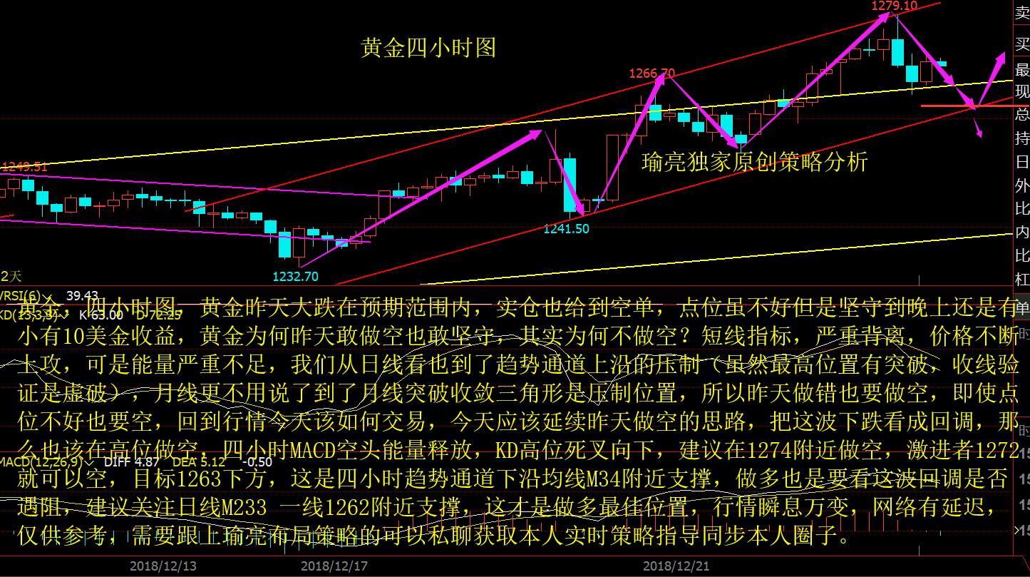 黄金,四小时图,黄金昨天大跌在预期范围内,实仓也给到空单,点位虽不好但是坚守到晚上还是有小有10美金收益,黄金为何昨天敢做空也敢坚守,其实为何不做空?短线指标,严重背离,价格不断上攻,可是能量严重不足,我们从日线看也到了趋势通道上沿的压制(虽然最高位置有突破,收线验证是虚破),月线更不用说了到了月线突破收敛三角形是压制位置,所以昨天做错也要做空,即使点位不好也要空,回到行情今天该如何交易,今天应该延续昨天做空的思路,把这波下跌看成回调,那么也该在高位做空,四小时MACD空头能量释放,KD高位死叉向下,建议在1274附近做空,激进者1272就可以空,目标1263下方,这是四小时趋势通道下沿均线