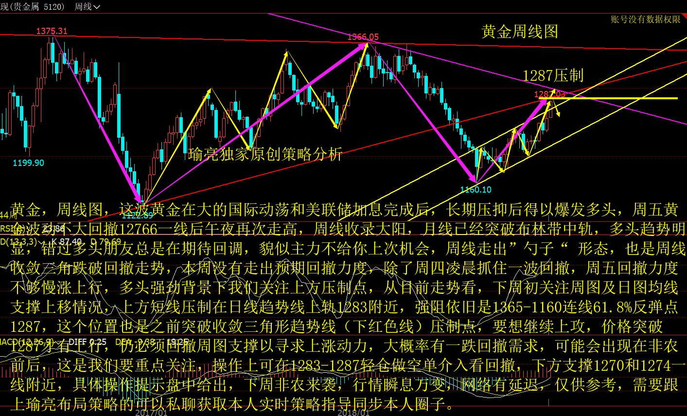 黄金,周线图,这波黄金在大的国际动荡和美联储加息完成后,长期压抑后得以爆发多头,周五黄金波动不大回撤12766一线后午夜再次走高,周线收录大阳,月线已经突破布林带中轨,多头趋势明显,错过多头朋友总是在期待回调,貌似主力不给你上次机会,周线走出”勺子“ 形态,也是周线收敛三角跌破回撤走势,本周没有走出预期回撤力度,除了周四凌晨抓住一波回撤,周五回撤力度不够慢涨上行,多头强劲背景下我们关注上方压制点,从目前走势看,下周初关注周图及日图均线支撑上移情况,上方短线压制在日线趋势线上轨1283附近,强阻依旧是1365-1160连线61.8%反弹点1287,这个位置也是之前突破收敛三角形趋势线(下红色线
