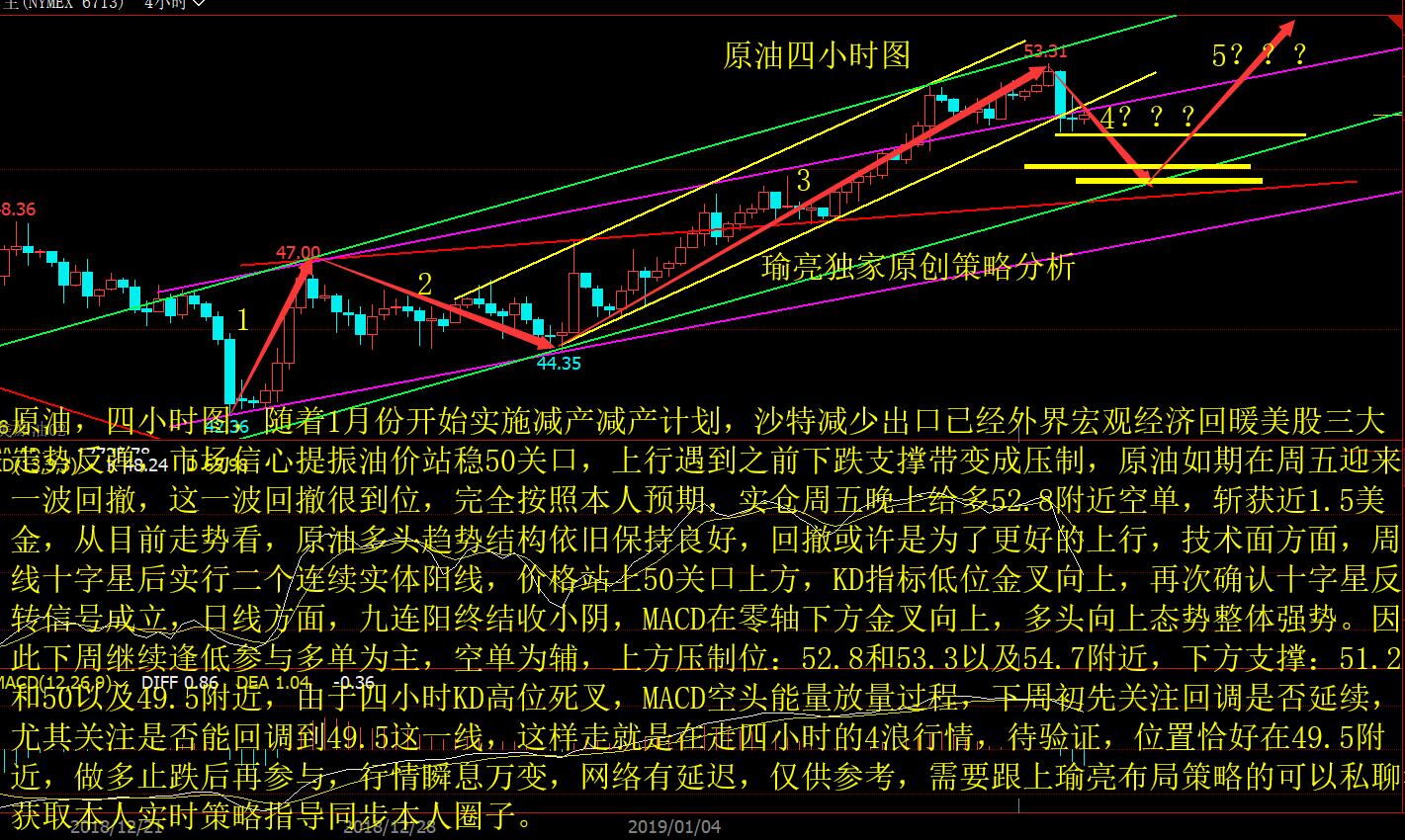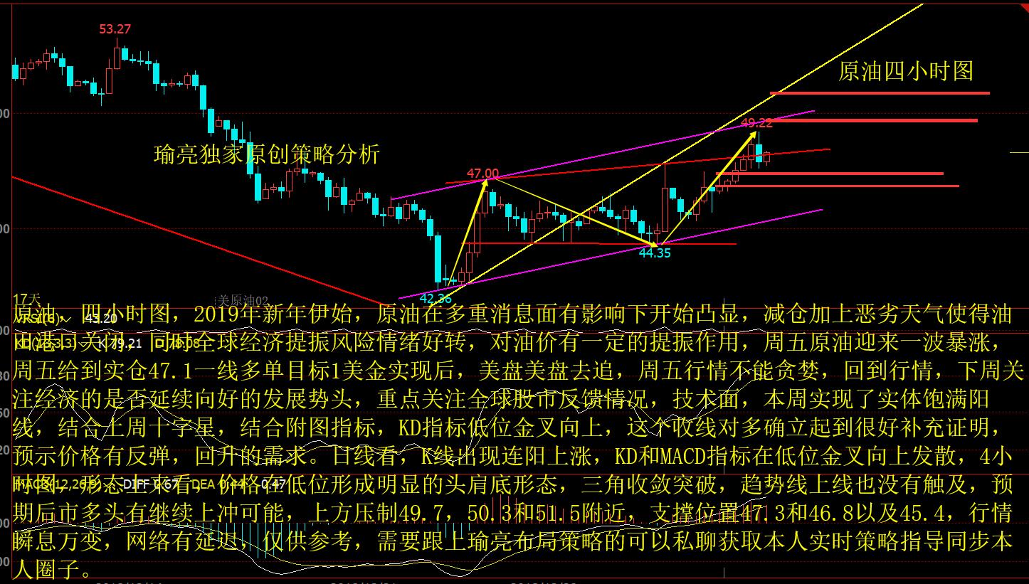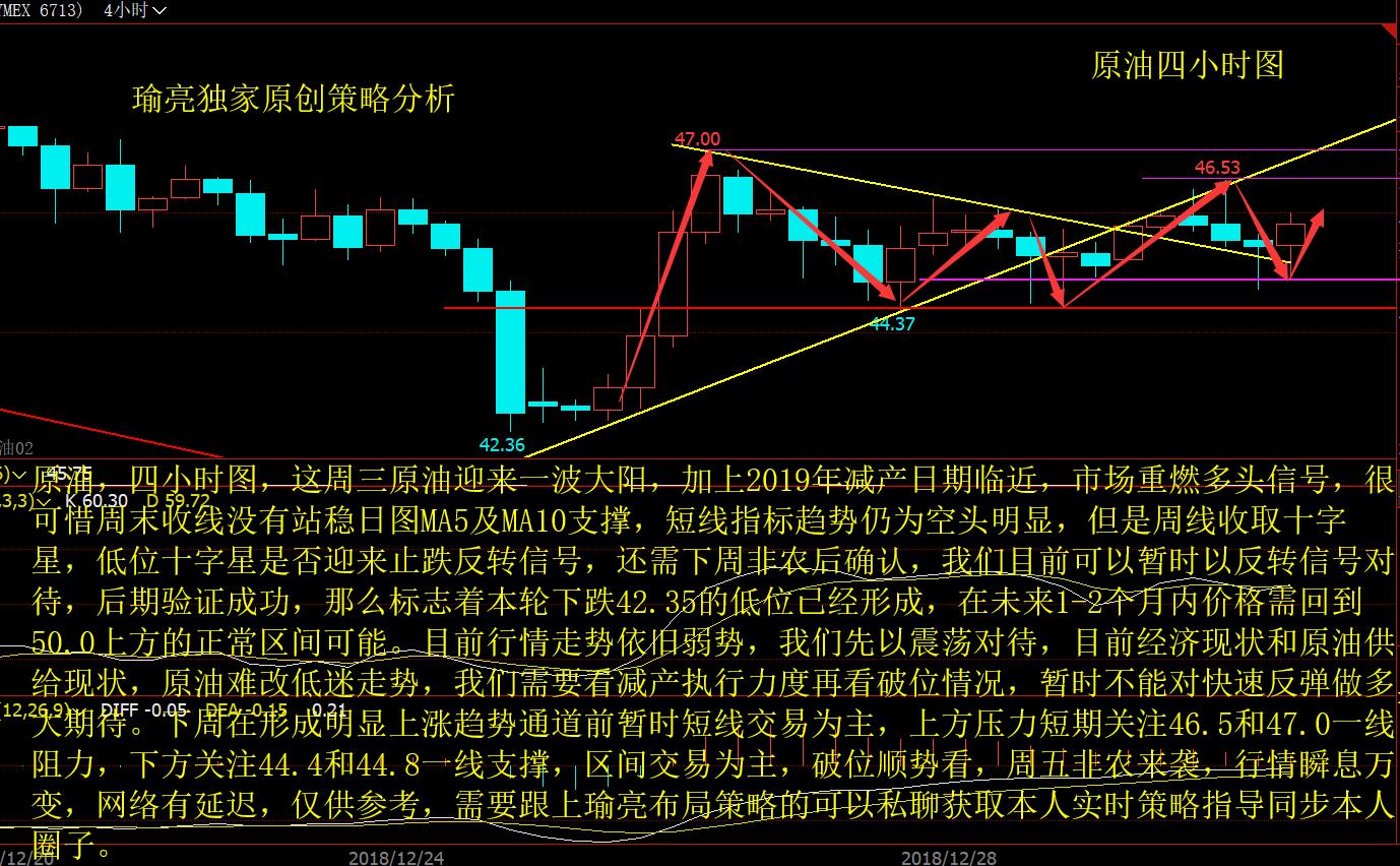 消息面解读:影响原油价格的因素: 1地缘政治:美国再次恢复了对伊朗的核制裁,叙利亚地方武装与政府展开冲突等,这些消息对原油来说都有不小的影响; 2供求关系:全球经济增速放缓;中国作为主要进口国,本周公布的制造业PMI跌破50荣枯线等,市场认为这些因素会造成原油需求下降 ,美国产量在2018年年末创新高,周六凌晨公布的EIA原油库存也在增加;沙特称OPEC减产协议将在2019年1月份开始显现效果; 3汇率:原油以美元作为结算货币,美联储讲话影响,那么汇率变动也势必会影响到原油的价格走势; 4市场情绪:美国政府的停摆,经济预期的下调,股市的剧烈波动,让市场避险情绪持续升温,也会对原油造成一定的压