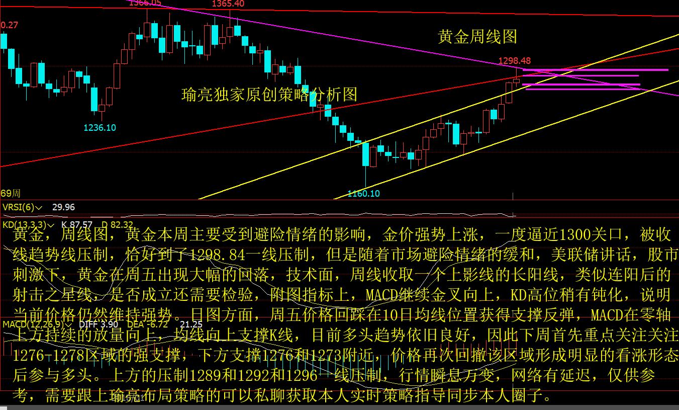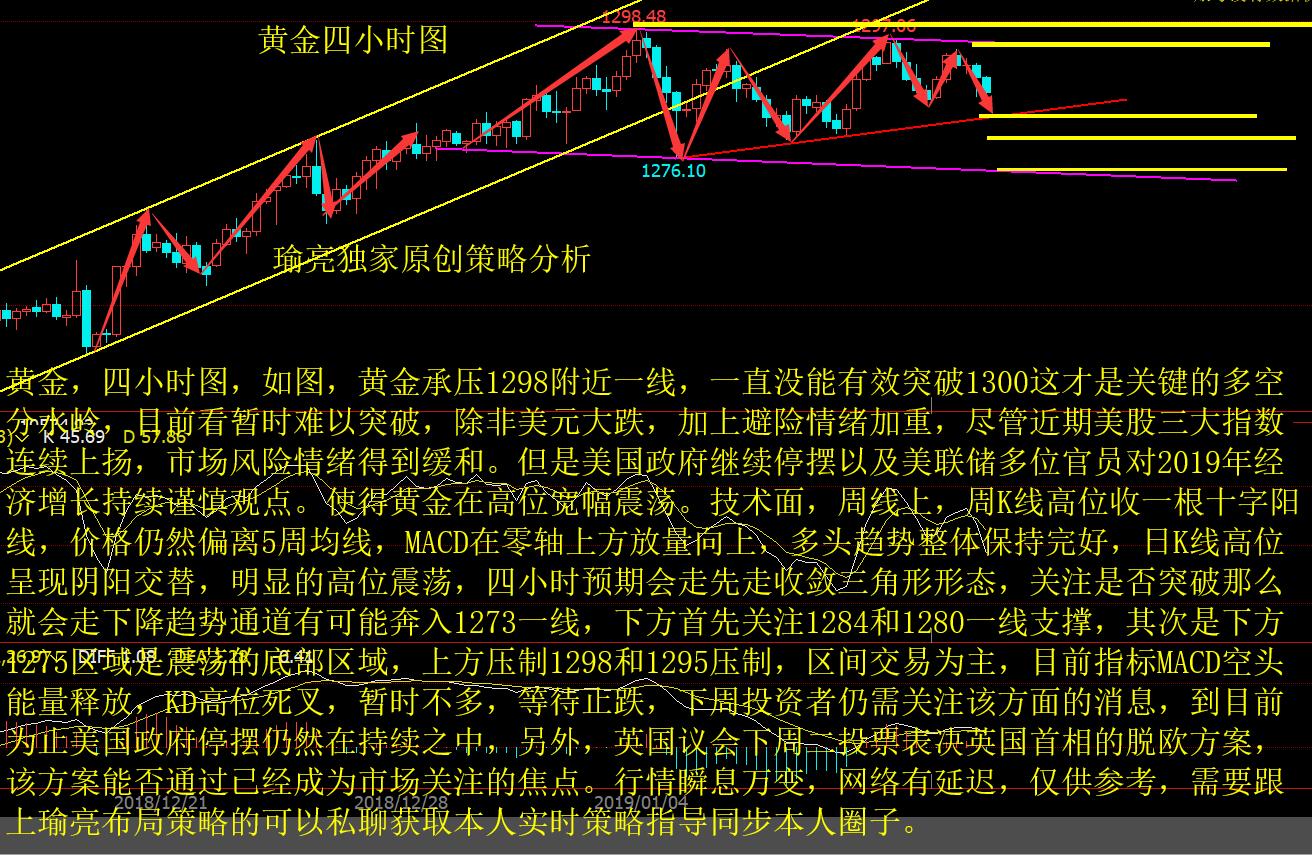 黄金,四小时图,如图,黄金承压1298附近一线,一直没能有效突破1300这才是关键的多空分水岭,目前看暂时难以突破,除非美元大跌,加上避险情绪加重,尽管近期美股三大指数连续上扬,市场风险情绪得到缓和。但是美国政府继续停摆以及美联储多位官员对2019年经济增长持续谨慎观点。使得黄金在高位宽幅震荡。技术面,周线上,周K线高位收一根十字阳线,价格仍然偏离5周均线,MACD在零轴上方放量向上,多头趋势整体保持完好,日K线高位呈现阴阳交替,明显的高位震荡,四小时预期会走先走收敛三角形形态,关注是否突破那么就会走下降趋势通道有可能奔入1273一线,下方首先关注1284和1280一线支撑,其次是下方127