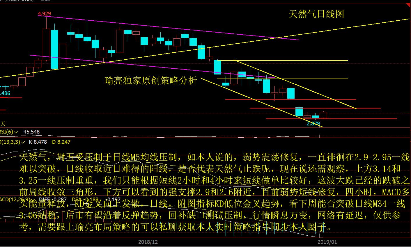 天然气,周五受压制于日线M5均线压制,一直徘徊在2.9-2.95一线难以突破,日线收取近日难得的阳线,是否代表天然气止跌呢,现在说还太早,上方3.14和3.25一线压制重重,我们只能根据短线2小时和4小时来短线做单比较好,这波大跌已经的跌破之前周线收敛三角形,下方可以看到的强支撑2.9和2.6附近,目前弱势短线修复,四小时,MACD多头能量释放,KD金叉向上发散,日线,附图指标KD低位金叉趋势,看下周能否突破日线M34一线3.06站稳,后市有望沿着反弹趋势,回补缺口测试压制,行情瞬息万变,网络有延迟,仅供参考,需要跟上瑜亮布局策略的可以私聊获取本人实时策略指导同步本人圈子 铜,四小时图,如图