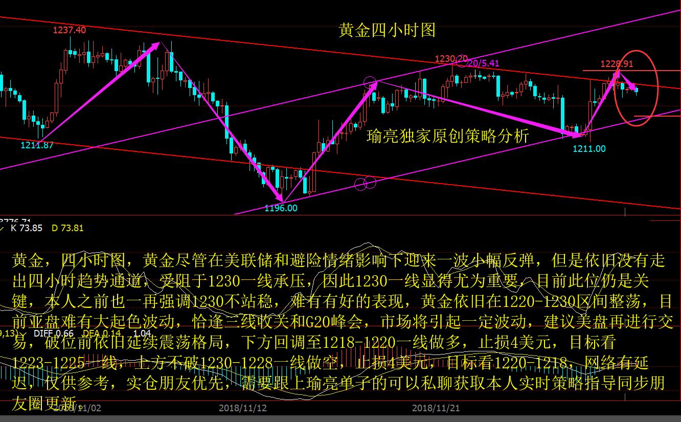 美联储周四(11月29日)公布11月会议纪要,但市场对此反映平淡,投资者已经将焦点转向定于周五开幕的G20峰会,相关消息预计将对短期金融市场走势产生影响。除了G20峰会之外,北京时间周五晚间美联储“三号人物”威廉姆斯将发表讲话,鉴于本周稍早美联储主席鲍威尔和副主席克拉里达讲话都曾引发市场波动,投资者需要防范威廉姆斯的言论也会影响市场。 金融市场有70%的时间是处于震荡走势,而趋势行情往往也只有占到30%。而所谓的趋势就是在一段时间内处于不断的高低点持续变化。对于震荡,就是陷于某个区域内进行来回,有时候甚至是日内无波动。如同此时的黄金,陷于1230至1220小区间震荡。今晚是周线和月线收官,能