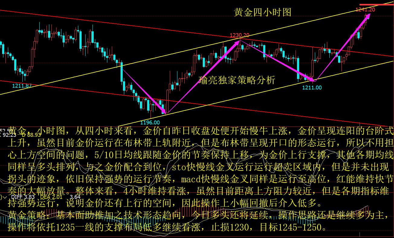昨日黄金在企稳1220上方之后金价开始慢牛上升最高触及1235一线,虽然美盘后半段有小幅的回撤,但是并不影响多头的趋势,日线以带有上影线的阳柱收尾,从日线的形态来看说明上方存在着强阻,短期金价无明显回撤的迹象,也彰显了多头的强势,并且已经突破1245一线的阻力,说明新的上行空间即将打开,该位置破位后金价再次去挑战1250也是迟早的事情。sto快慢线继续保持金叉向上发散,虽然目前已经运行至超卖区域,但是金叉上探的力度并未减缓,macd快慢线同样是维持金叉向上延伸,并且红能已经开始大幅度的快节奏放量。整体而言,日线方面明显是多方占优,操作上维持低多为主,空单暂时不建议布局。 黄金,四小时图,从四