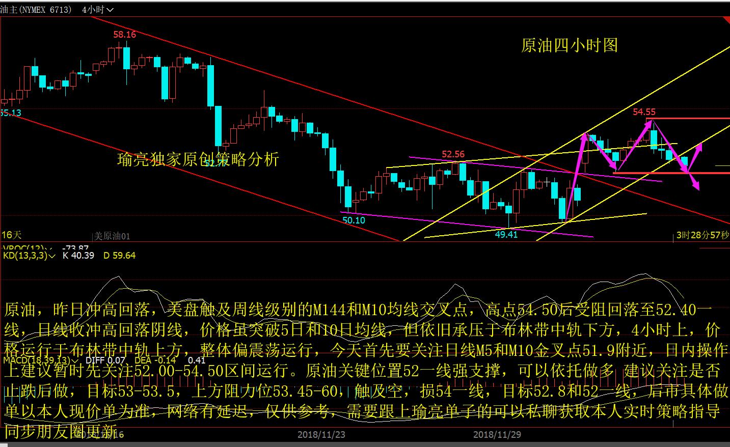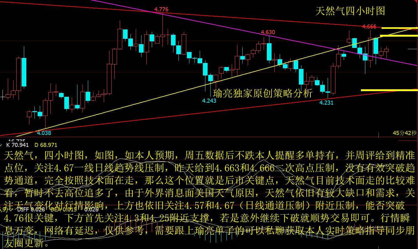 天然气,四小时图,如图,如本人预期,周五数据后不跌本人提醒多单持有,并周评给到精准点位,关注4.67一线日线趋势线压制,昨天给到4.663和4.666二次高点压制,没有有效突破趋势通道,完全按照技术面在走,那么这个位置就是后市关键点,天然气目前技术面走的比较难看,暂时不去高位追多了,由于外界消息面美国天气原因,天然气依旧有较大缺口和需求,关注天气变化对行情影响,上方也依旧关注4.57和4.67(日线通道压制)附近压制,能否突破4.76很关键,下方首先关注4.3和4.25附近支撑,若是意外继续下破就顺势交易即可。行情瞬息万变,网络有延迟,仅供参考,需要跟上瑜亮单子的可以私聊获取本人实时策略指导