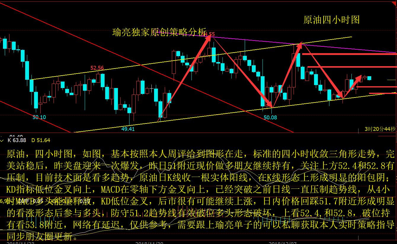消息面分析:本周(12月3日--7日)原油开盘于52.45,最高54.55,最低50.08,收盘于52.13,上涨1.41美元,涨幅2.78%。原油本周主要受到情绪化的影响比较严重。本周受G20峰会的影响跳空高开。另外影响油价的主要因素就是OPEC会议减产会议。 欧佩克成员和非欧佩克承压在周五(12月7日)经过艰难的谈判最终达成减产协议,欧佩克减产80万桶/日,非欧佩克减产40万桶/日。减产从2019年1月开始,确认在10月份石油产出的基础上减产六个月,下次欧佩克会议将于2019年4月在维也纳举行。其中沙特将超过市场份额的程度来减产石油,暗示1月份减产石油50万桶/日,沙特10月份产出107