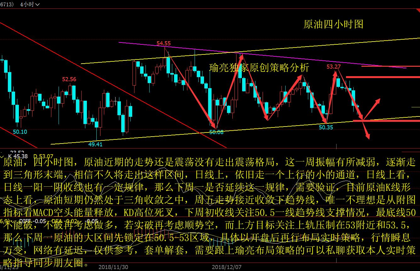 欧佩克在上周五确定了减产,会议结果显示欧佩克和非欧佩克同意减产120万桶/日,原油短线受此刺激迎来了强势上涨。但是在欧佩克确定减产后,欧佩克减产动作却表现得较为缓慢这引发了市场对其减产力度的担忧。最近这三周原油就是维持在50-54一个区间震荡整理行情。每天原油都是2美金来回涨涨跌跌的行情,行情整体维持震荡走势。 那么对于下周走势来看,最重要的就是去关注50-54区间的突破了,只有这个区间打破了原油走势才能迎来比较明朗的走势,趋势上瑜亮个人还是比较看好油价守住近期低点49.5/50支撑向上突破,中期油价有望向55/57区域迈进。 下周初短线操作上来看的话,原油短期仍然处于三角收敛之中,周五回落