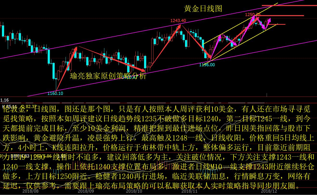 基本面分析:本周(12月3日--7日)黄金开盘于1222.64,最高1250.04,最低1221.00,收盘1248.5,上涨26.36美元,涨幅2.16%。 美国三大股指创3月以来最大单周跌幅,标普500指数累跌4.6%, 道指累跌4.5%,纳指累跌4.9%。小盘古罗素2000指数跌5.56%,创2016年1月份以来最大单周跌幅。美国11月非农就业人口增加15.5万人,不及预期19.8万人,失业率维持在3.7%,11月平均每个小时工资同比3.1%,不及预期的3.2%。在非农数据公布后,美联储今年12月加息25个基点至2.25%--2.5%区间的概率从非农前在78.4%,降至74.9%。 美