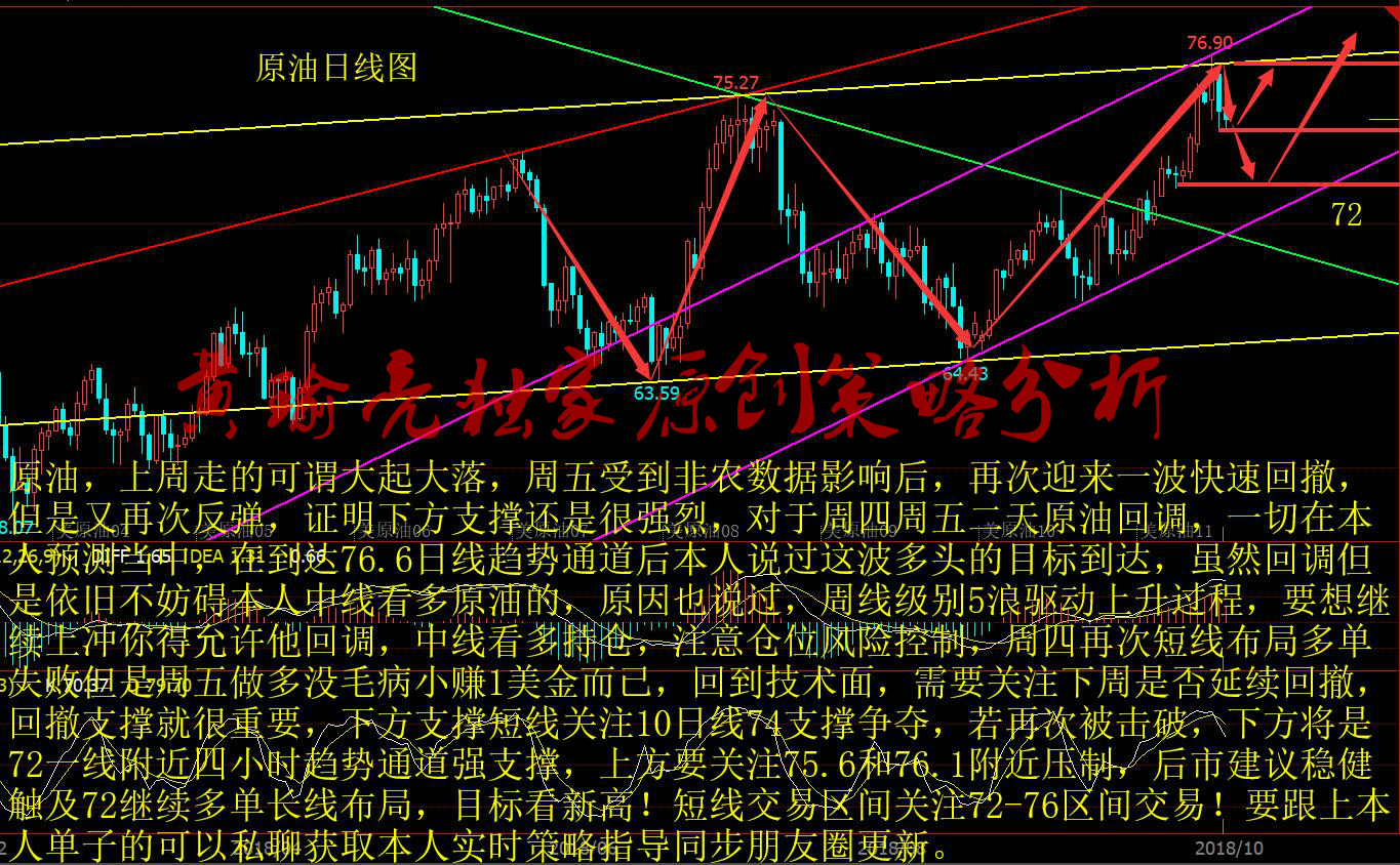 由于对全球原油供应短缺的担忧,美原油一度到76.9美元/桶附近,但最终还是在沙特和俄罗斯增产的消息影响下,回吐本周的涨幅。周六的美国原油钻井数连续三周下降至861座,这对下周美国原油的库存影响还是很大。 市场上的担忧和增产的不确定性使得原油走势波动较大,短期的回调一方面是增产的压力,另一方面是在大幅上涨后的技术性回调。从目前整体的情况来看,原油还是多头的趋势,对于增产来填补伊朗减少的缺口还是有待确定,原油上涨的路还是冲满曲折的。 周线上,油价呈U型的反转,K线收取4连阳,今年以来的走势呈阶梯式的增长,市场都说原油会到80美元/桶,从目前的趋势来看,加上基本面的利好,这也不是不可能的。