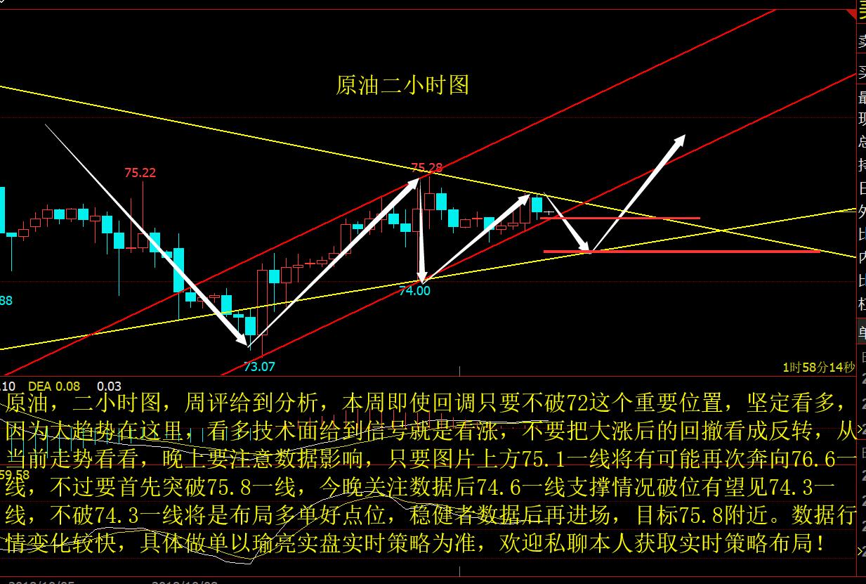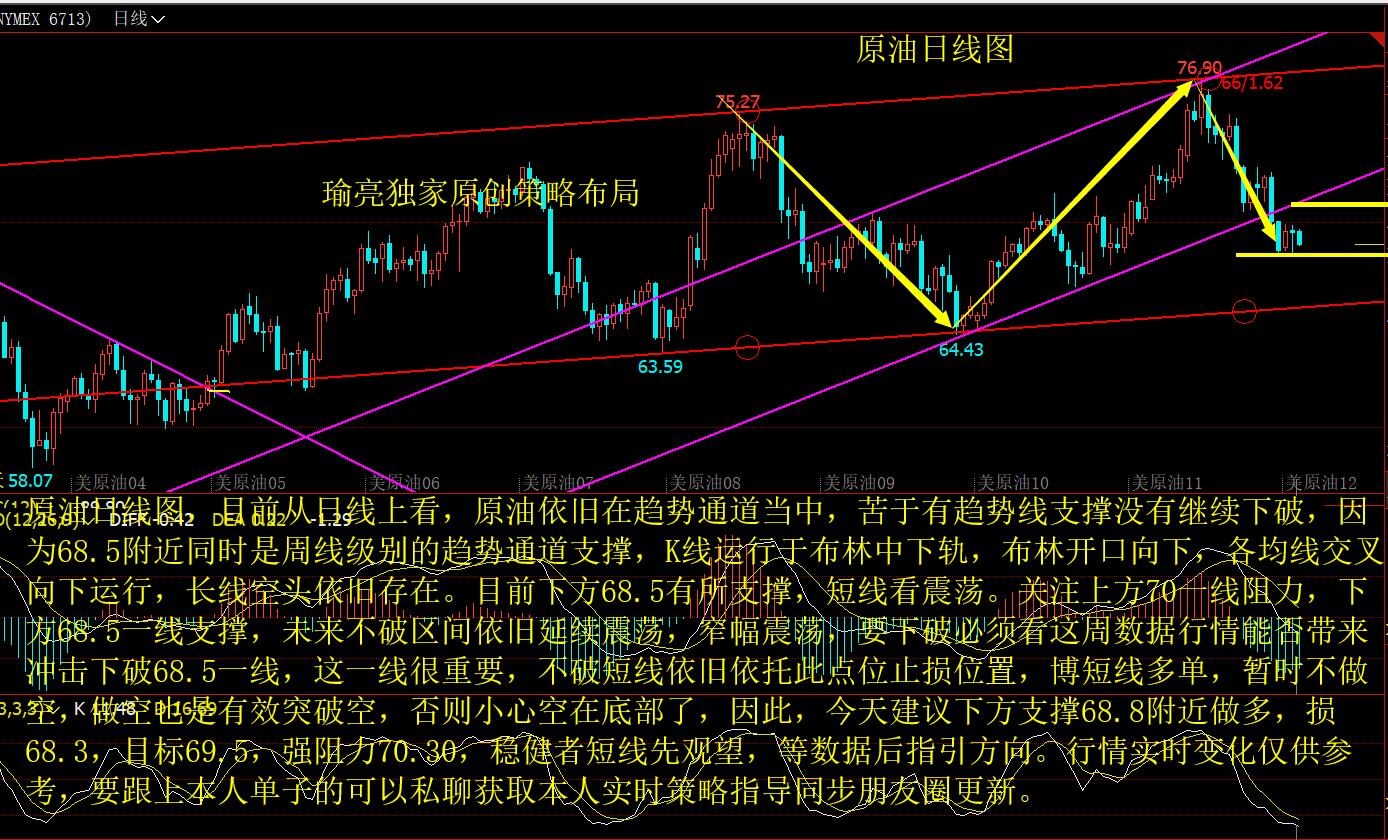 原油,日线图,从图中可以清楚看到,原油这二天一直徘徊在趋势通道附近小幅震荡,上不上,下没有能量突破,貌似在等待一波消息刺激行情,迎来一波大反弹或者破位行情,这二天,本人对于原油思路延续周评的思路,低多,只要不破趋势通道线,多单暂时是最佳性价比的单子,相比空单,空单,我们更想看到破位反弹不破再进是比较理性,否则小心低位被套死,因此在数据前我们可以暂时观望,等行情突破或者启动后,根据信号顺势交易既可以。再次强调一下,这次下跌,只要不破趋势通道本人当成是回撤,原油经过前段时间的反弹触及到最高点77美金附近再次回落下探目前到了中轨附近支撑70.5附近,原油经过这几日的行情盘整修复再次收十字星,原油多