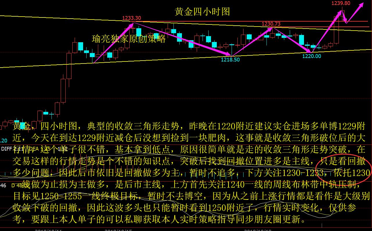 黄金,四小时图,典型的收敛三角形走势,昨晚在1220附近建议实仓进场多单博1229附近,今天在到达1229附近减仓后没想到捡到一块肥肉,这事就是收敛三角形破位后的大行情,这个单子很不错,基本拿到低点,原因很简单就是走的收敛三角形走势突破,在交易这样的行情走势是个不错的知识点,突破后找到回撤位置进多是主线,只是看回撤多少问题,暂时不追多,因此后市依旧是回撤做多为主,下方关注1230-1233,依托1230一线 做为 止损为主做多,是后市主线,上方首先关注1240一线的周线布林带中轨压制,目标见1250-1255一线终极目标,暂时不去博空,因为从之前上涨行情都是看作是大级别收敛下破的回撤,因此这