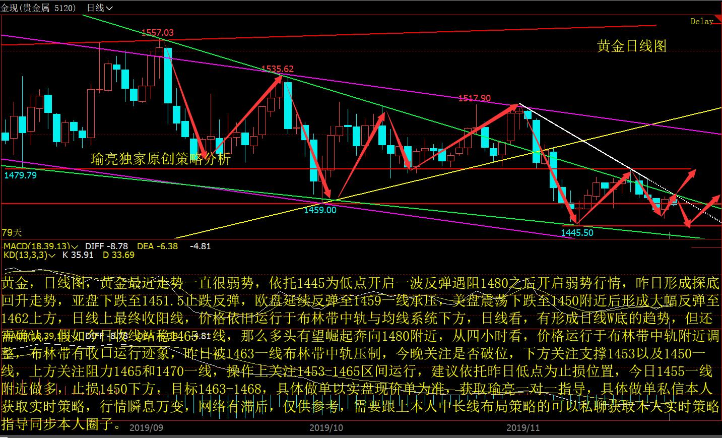 !-- x-tinymce/html -- 黄金,日线图,黄金最近走势一直很弱势,依托1445为低点开启一波反弹遇阻1480之后开启弱势行情,昨日形成探底回升走势,亚盘下跌至1451.5止跌反弹,欧盘延续反弹至1459一线承压,美盘震荡下跌至1450附近后形成大幅反弹至1462上方,日线上最终收阳线,价格依旧运行于布林带中轨与均线系统下方,日线看,有形成日线W底的趋势,但还需确认,假如今日收线站稳1465一线,那么多头有望崛起奔向1480附近,从四小时看,价格运行于布林带中轨附近调整,布林带有收口运行迹象,昨日被1463一线布林带中轨压制,今晚关注是否破位,下方关注支撑1453以及1450一