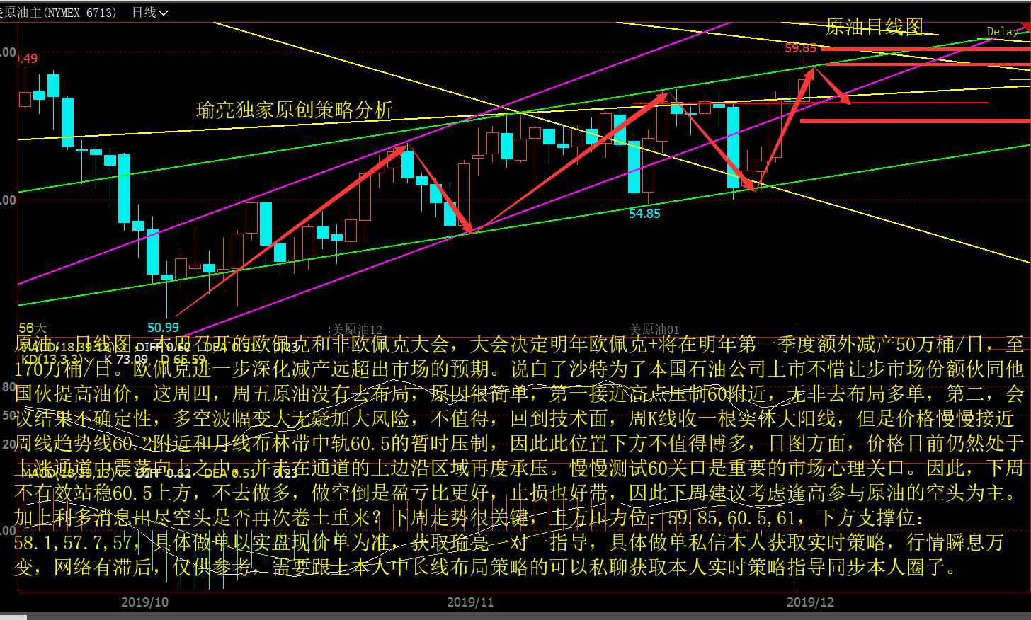 原油,日线图,本周召开的欧佩克和非欧佩克大会,大会决定明年欧佩克+将在明年第一季度额外减产50万桶/日,至170万桶/日。欧佩克进一步深化减产远超出市场的预期。说白了沙特为了本国石油公司上市不惜让步市场份额伙同他国伙提高油价,这周四,周五原油没有去布局,原因很简单,第一接近高点压制60附近,无非去布局多单,第二,会议结果不确定性,多空波幅变大无疑加大风险,不值得,回到技术面,周K线收一根实体大阳线,但是价格慢慢接近周线趋势线60.2附近和月线布林带中轨60.5的暂时压制,因此此位置下方不值得博多,日图方面,价格目前仍然处于上涨通道中震荡向上之中,并未在通道的上边沿区域再度承压。慢慢测试60关