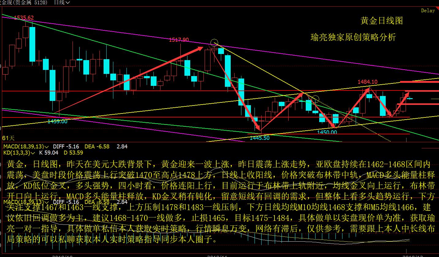 黄金,日线图,昨天在美元大跌背景下,黄金迎来一波上涨,昨日震荡上涨走势,亚欧盘持续在1462-1468区间内震荡,美盘时段价格震荡上行突破1470至高点1478上方,日线上收阳线,价格突破布林带中轨,MACD多头能量柱释放,KD低位金叉,多头强势,四小时看,价格连阳上行,目前运行于布林带上轨附近,均线金叉向上运行,布林带开口向上运行,MACD多头能量柱释放,KD金叉稍有钝化,留意短线有回调的需求,但整体上看多头趋势运行,下方关注支撑1467和1463一线支撑,上方压制1478和1483一线压制,下方日线均线M10均线1468支撑和M5均线1466,建议依旧回调做多为主,建议1468-1470